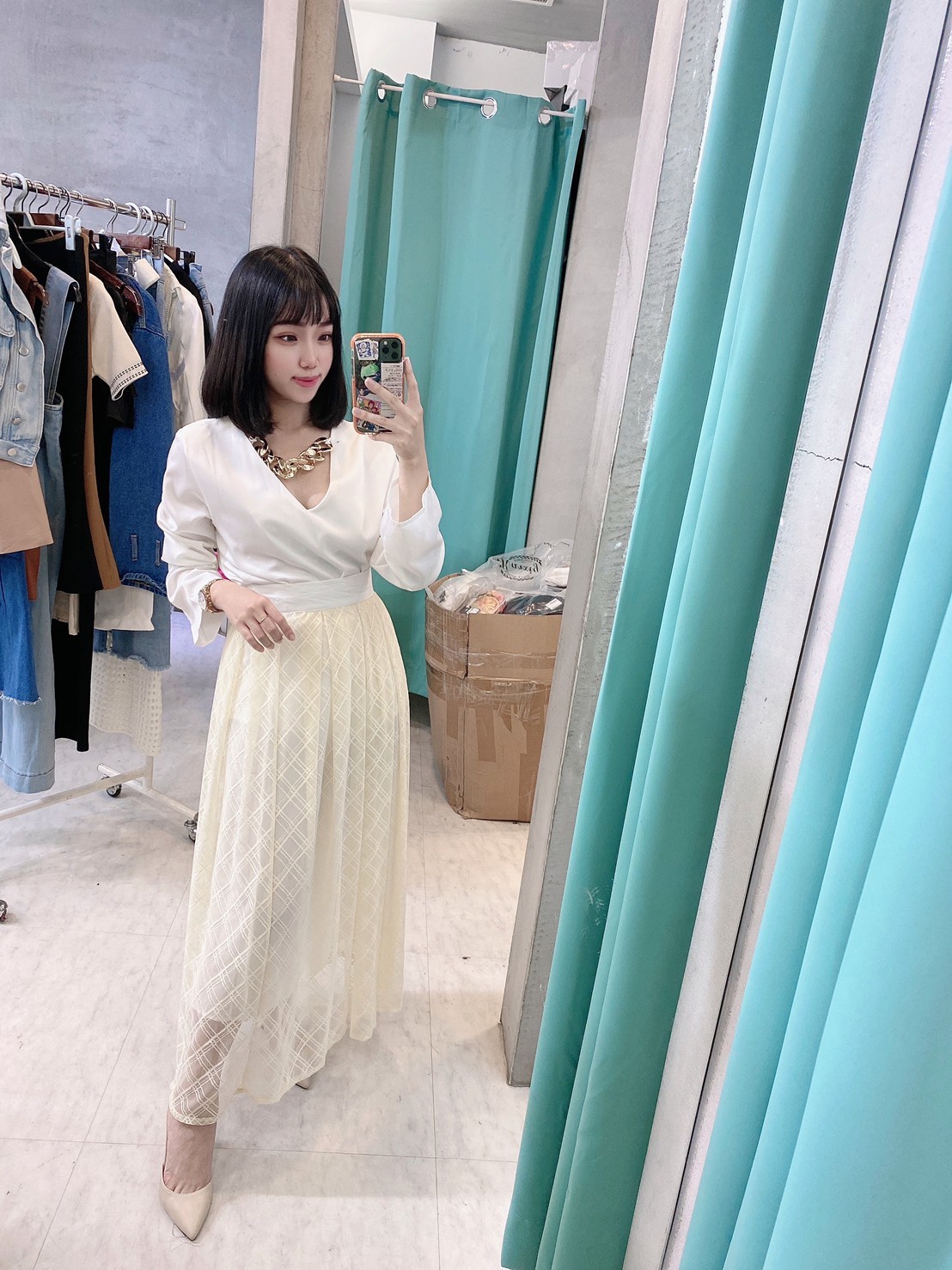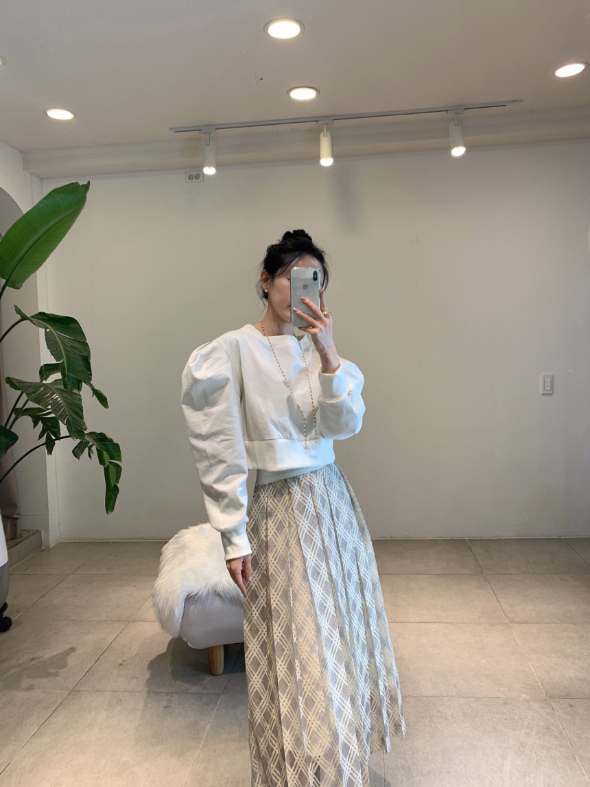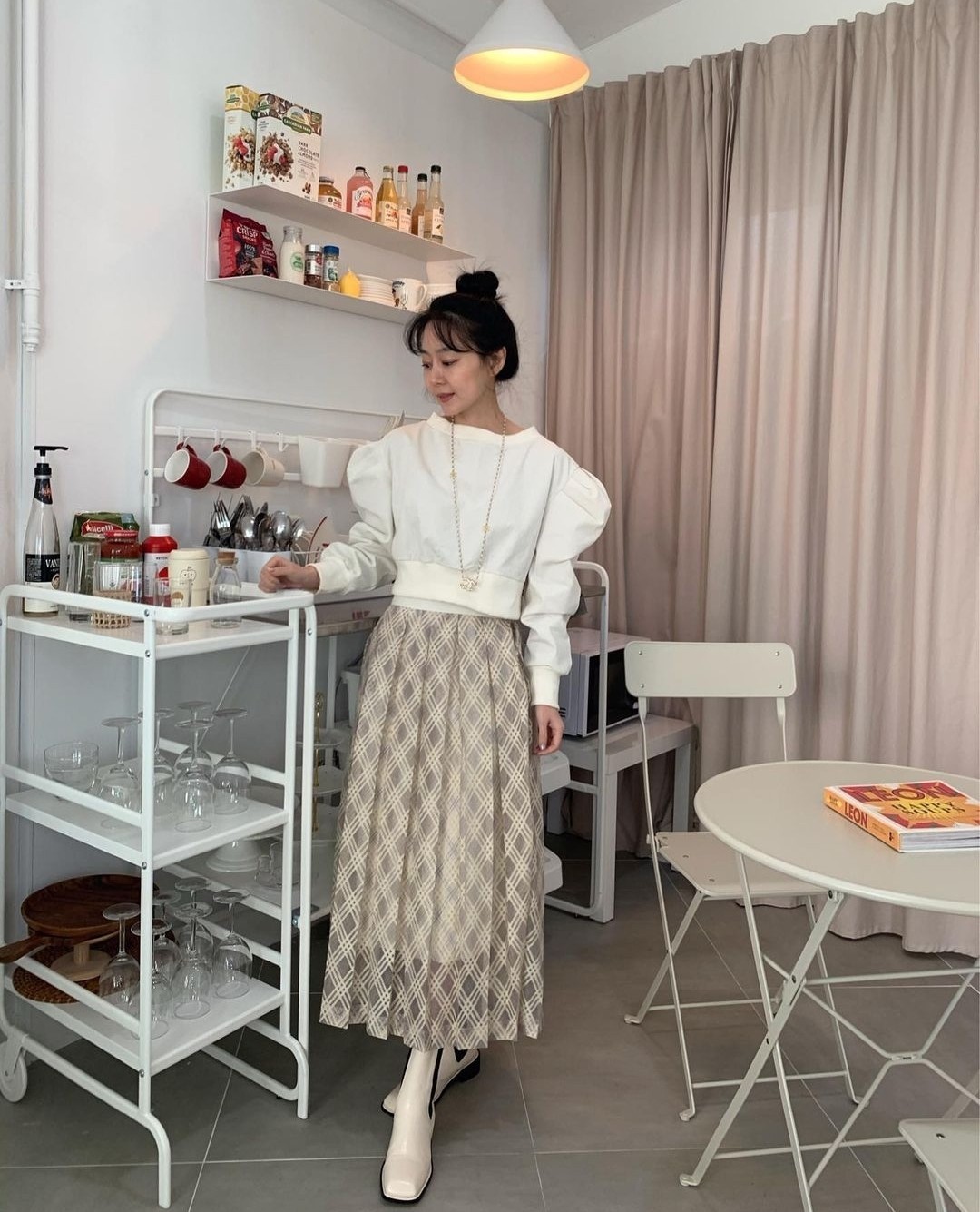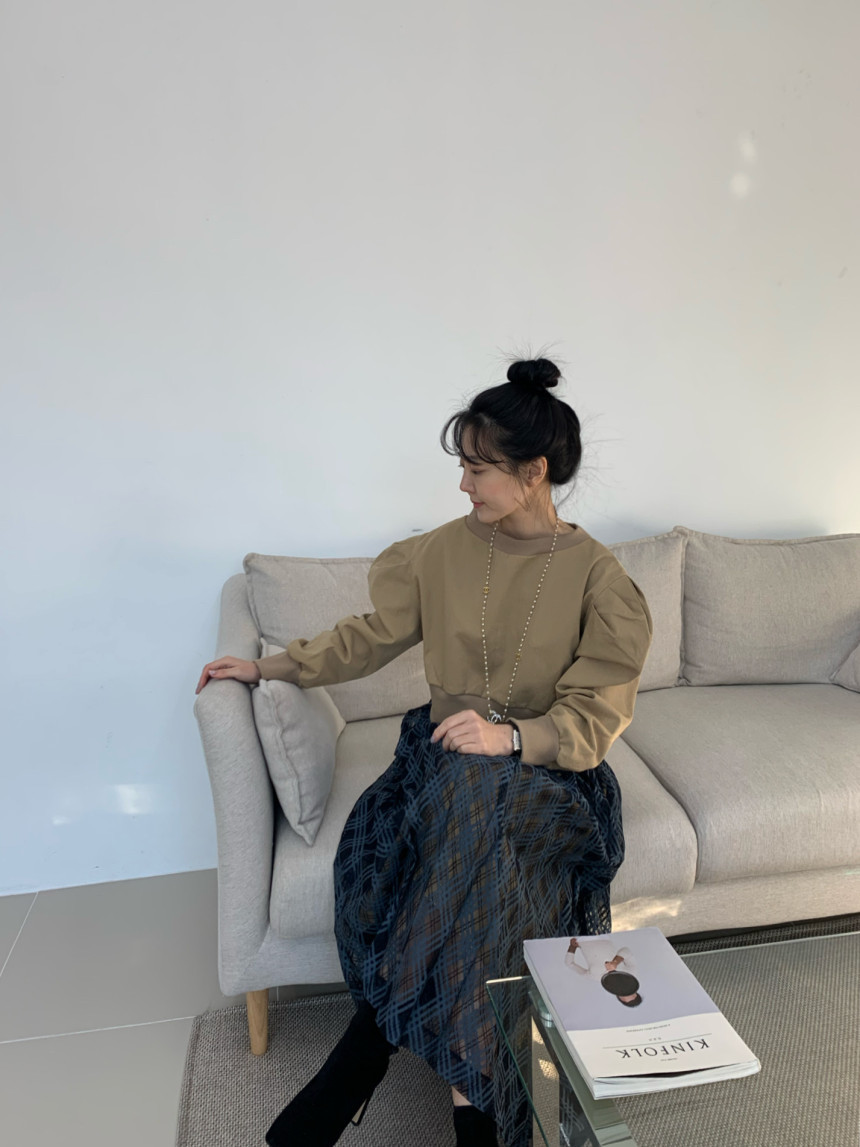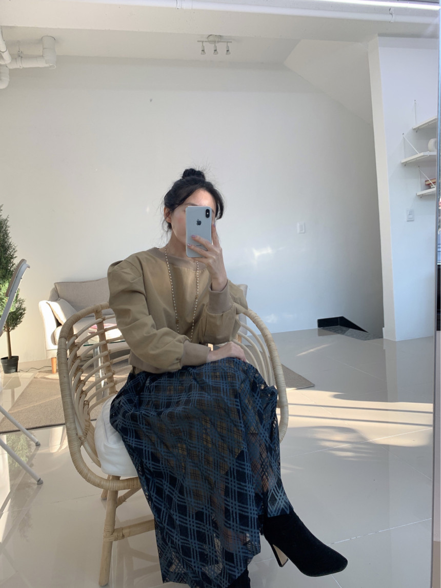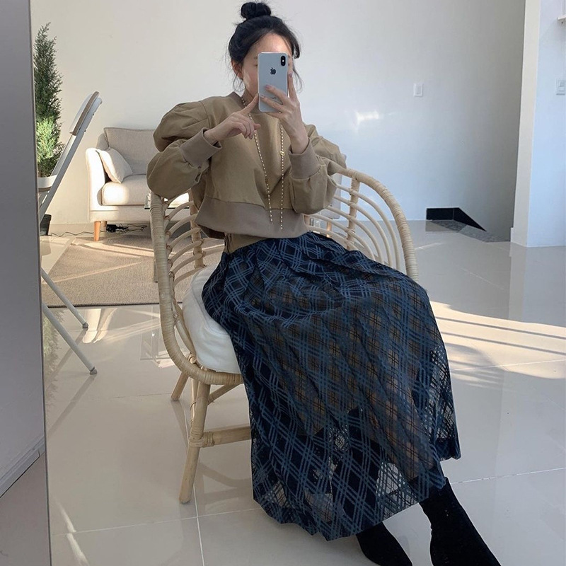 特殊面料 壓褶格紋網紗裙 (深藍/米杏)