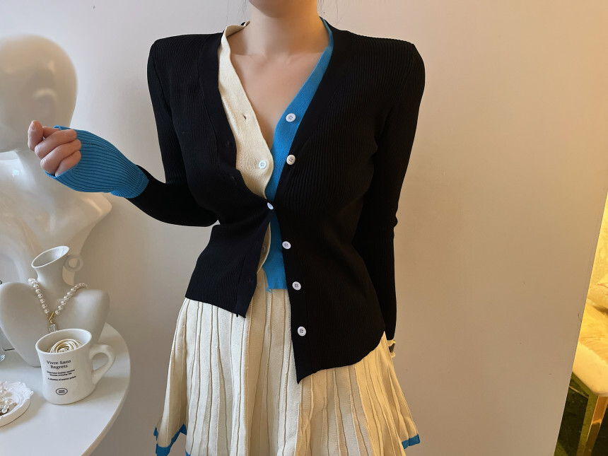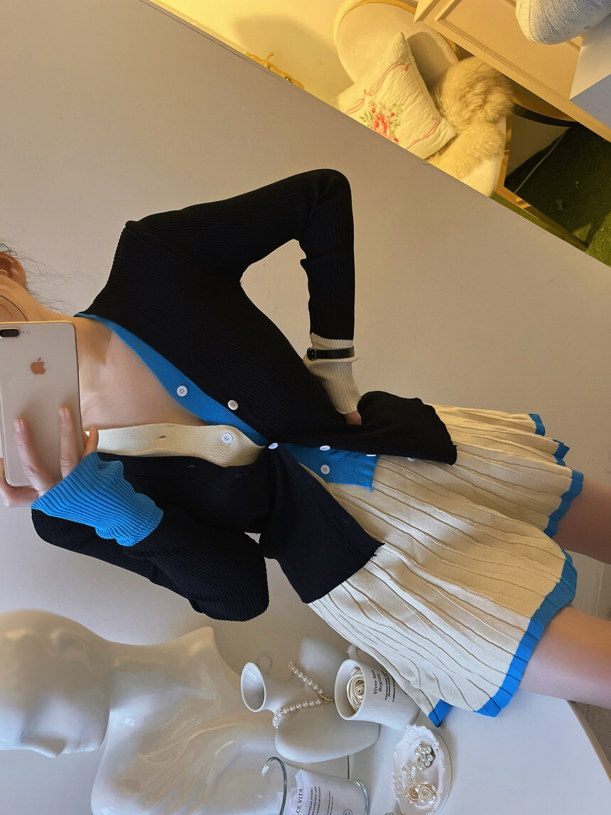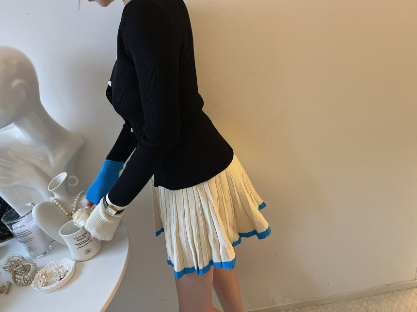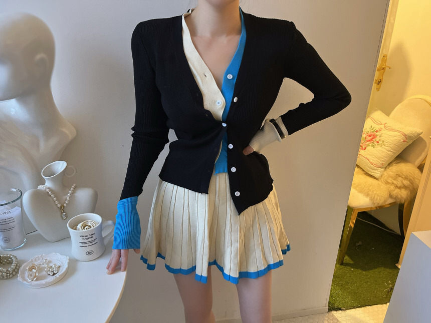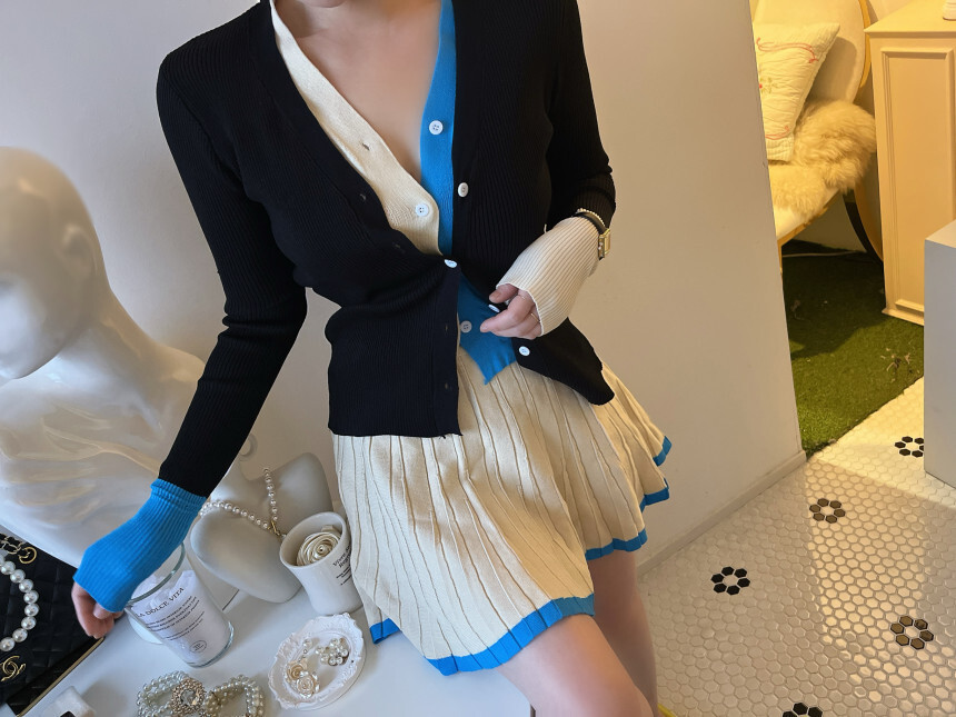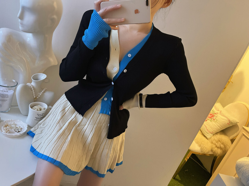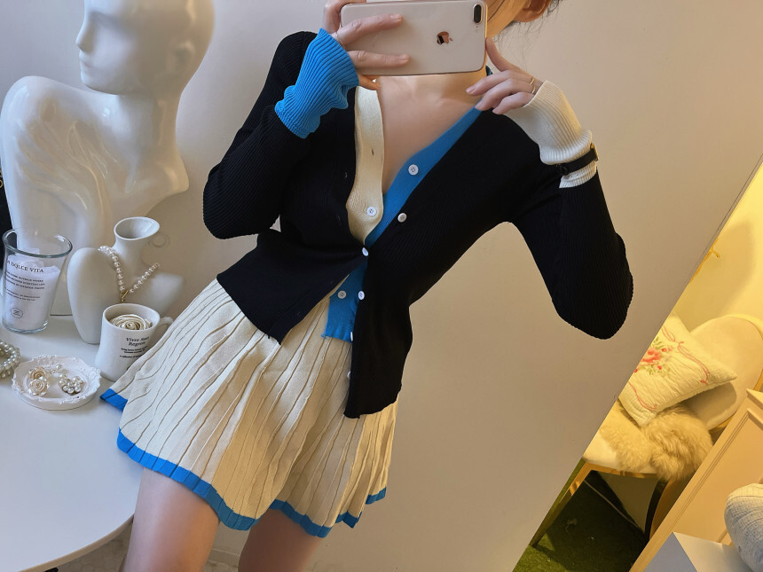 涼感針織撞色假2件外套+百褶裙(2件組)