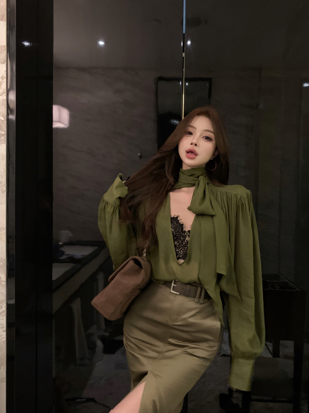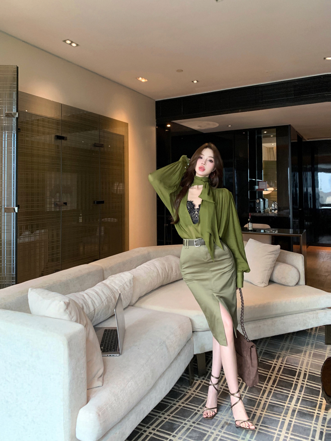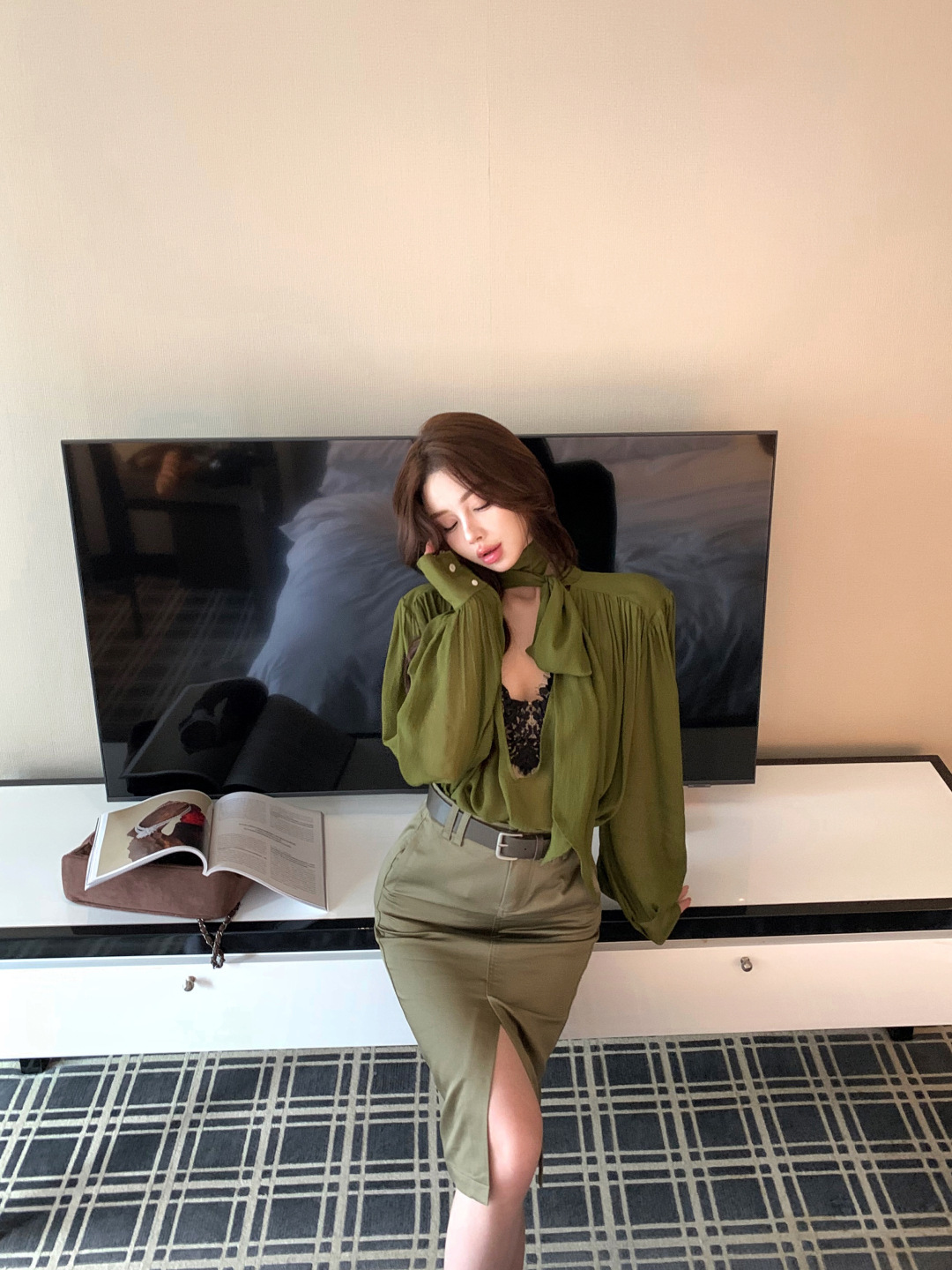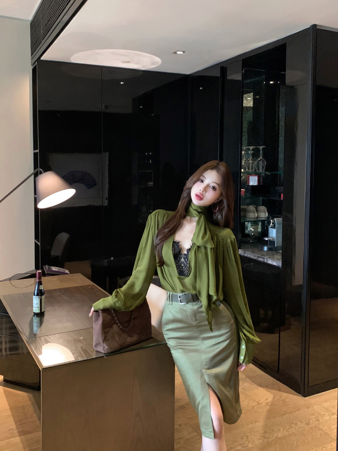 高級綠 V領飄帶襯衫+高腰鉛筆裙(2件組)