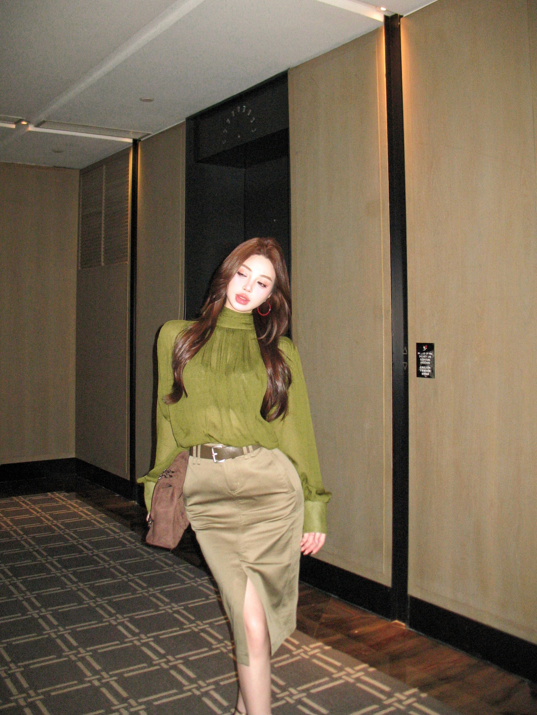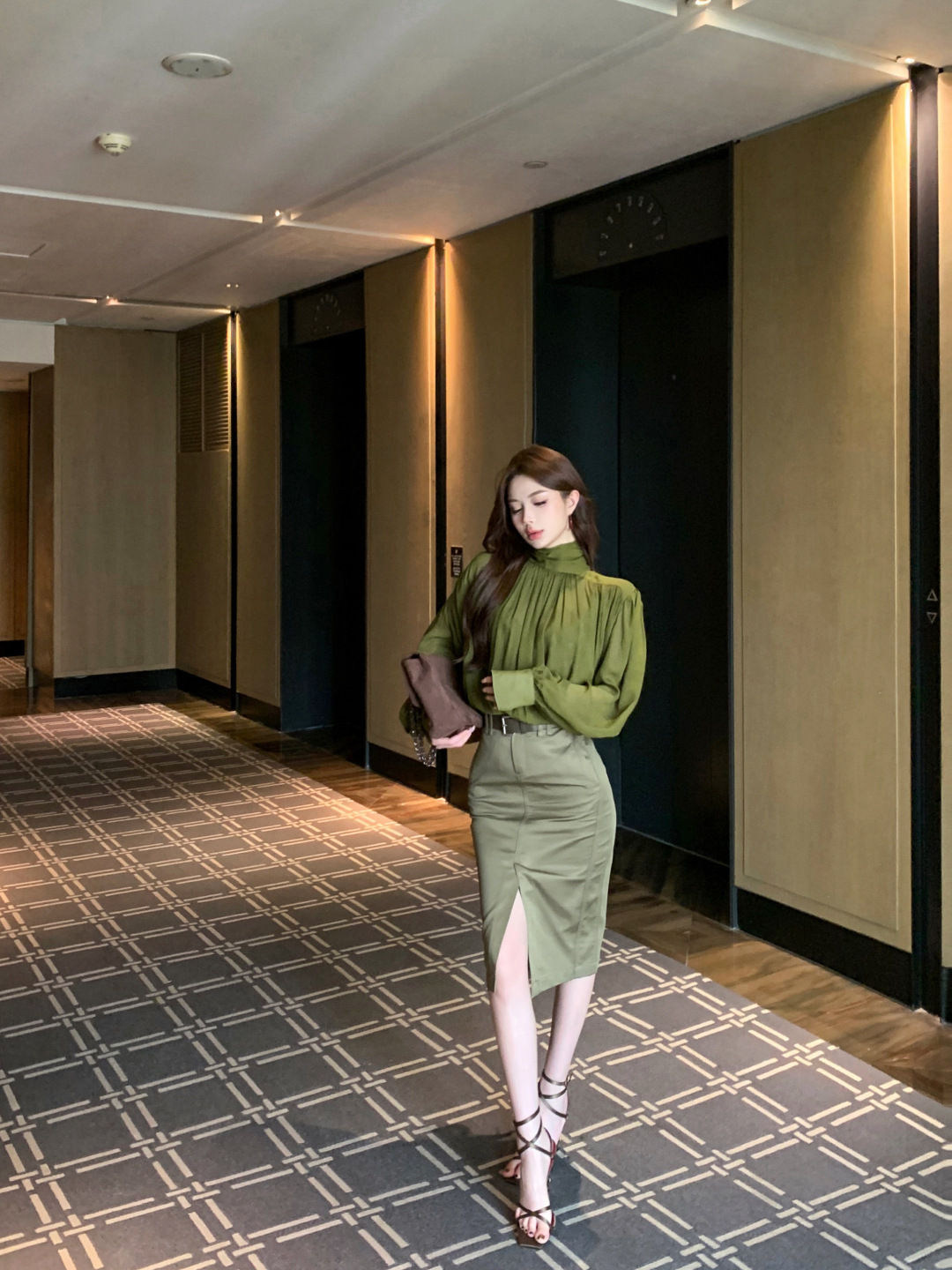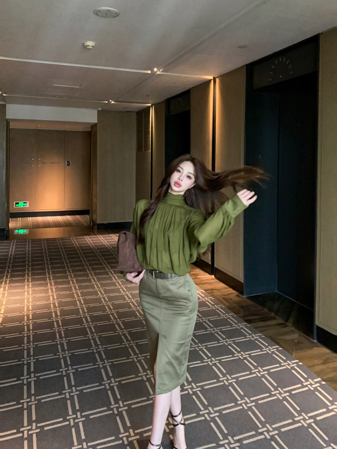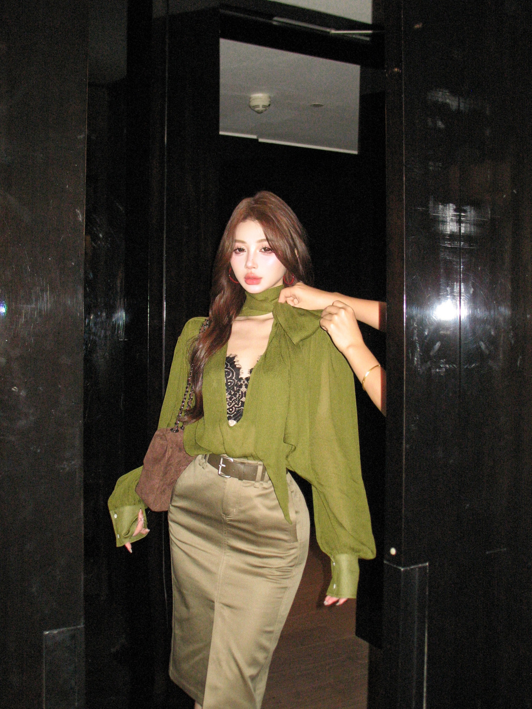 高級綠 V領飄帶襯衫+高腰鉛筆裙(2件組)