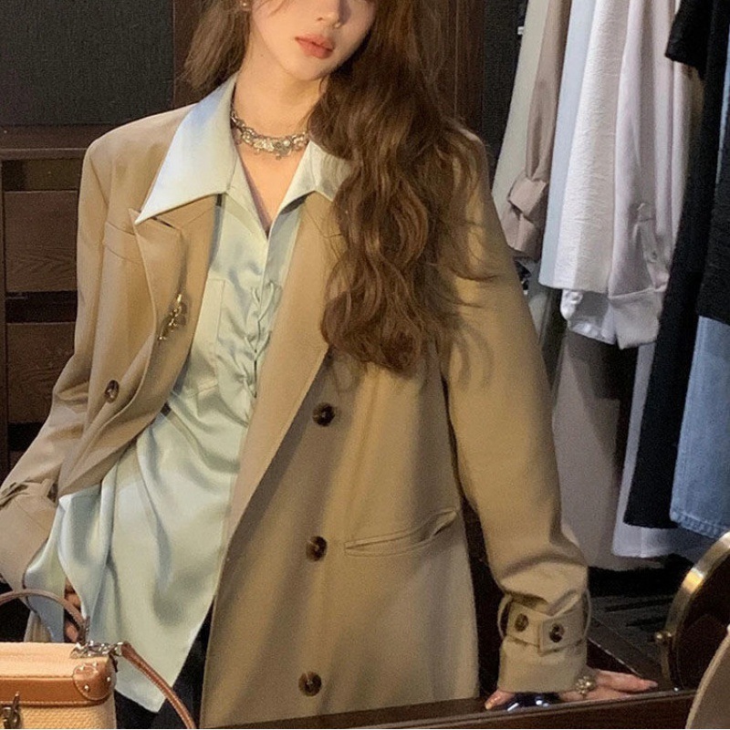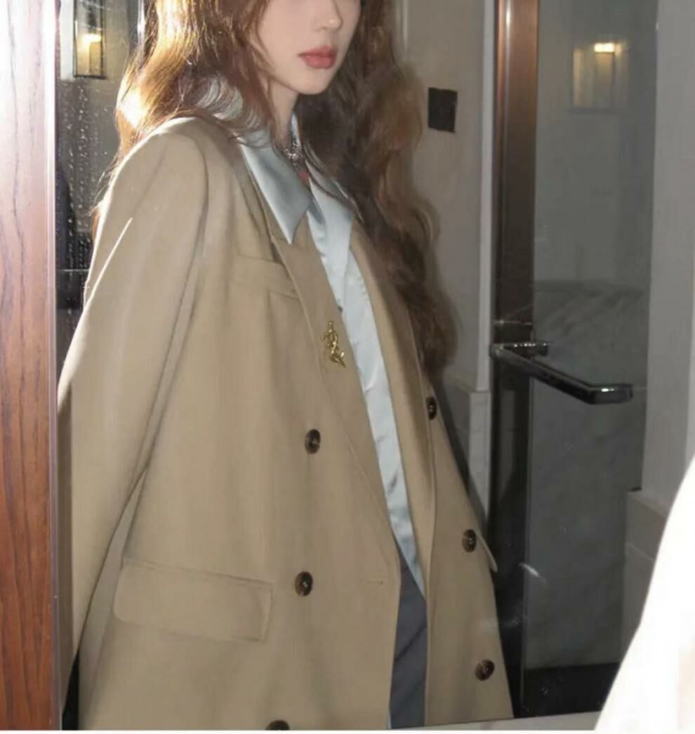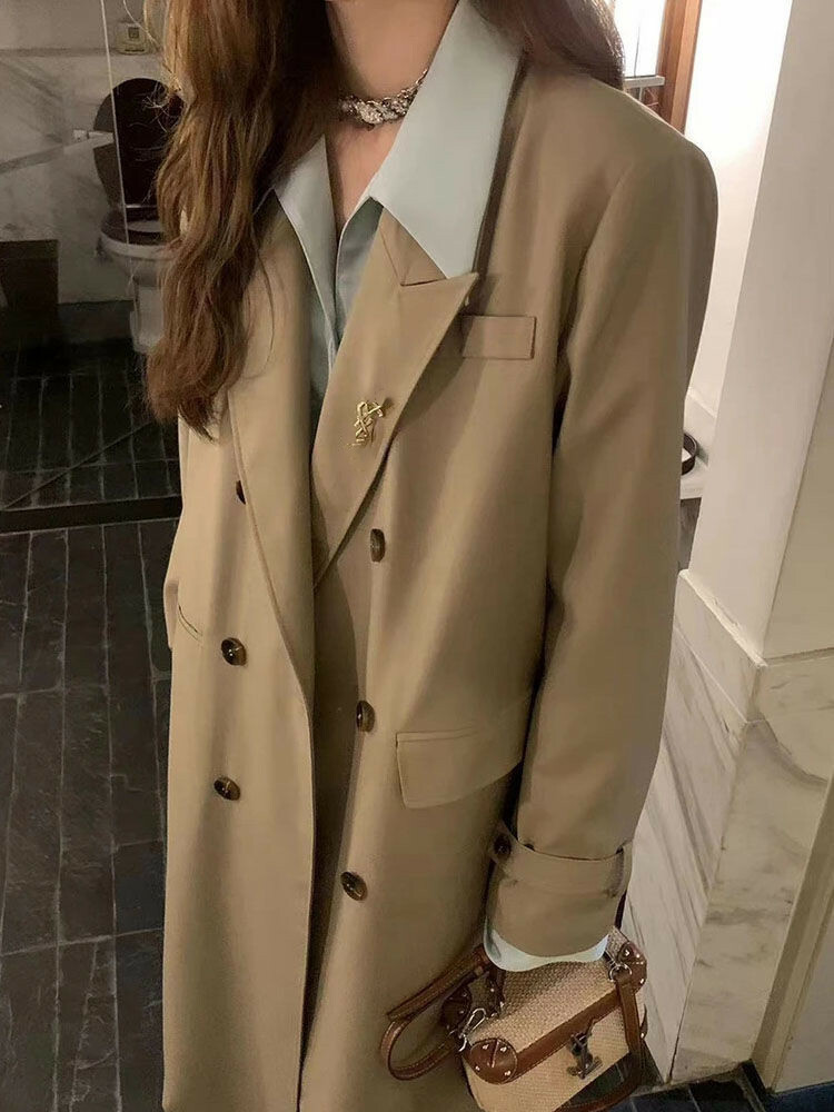 雙排扣長版風衣外套(附胸針)