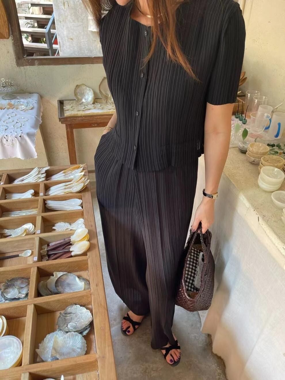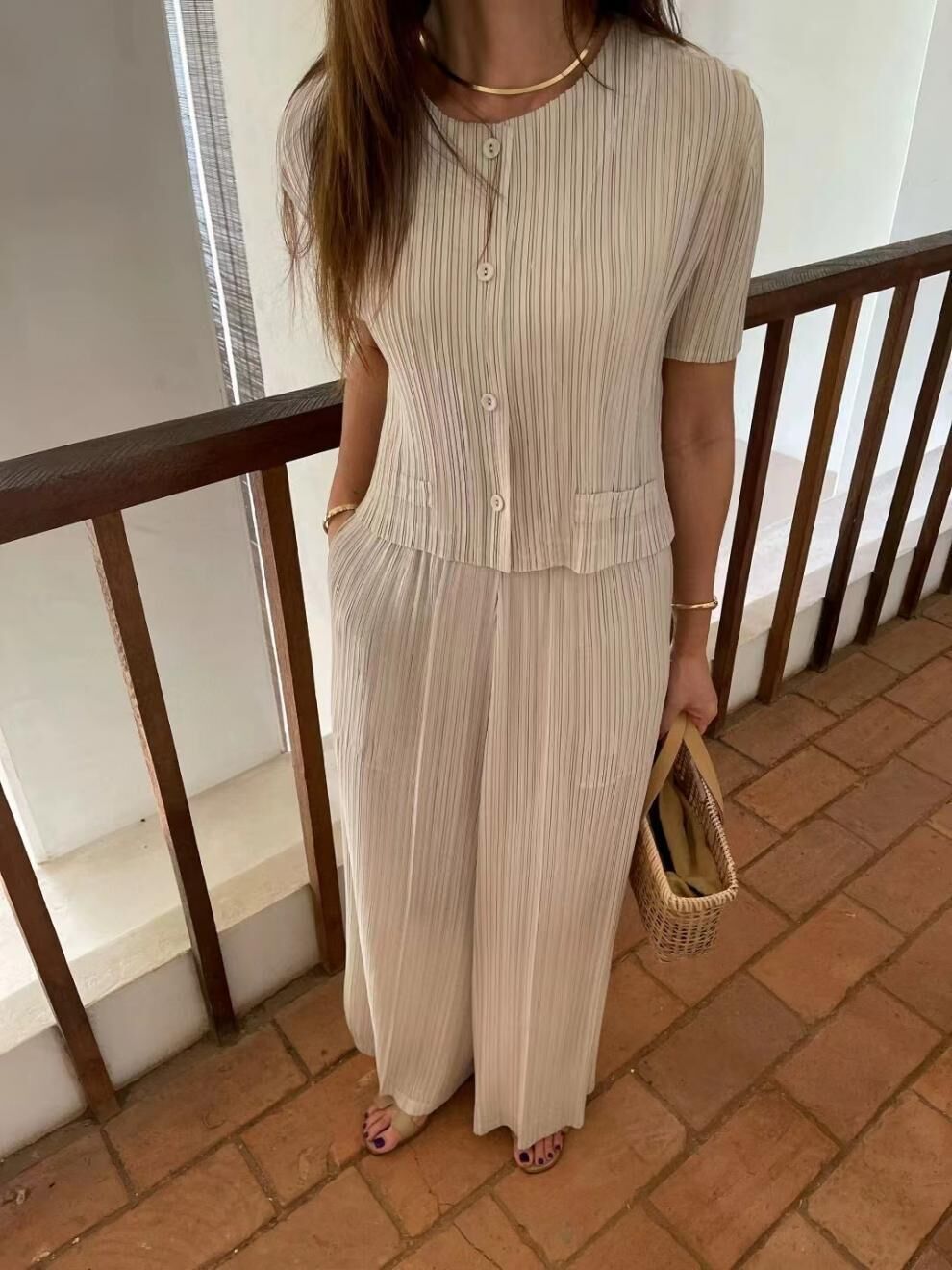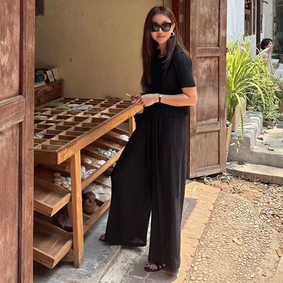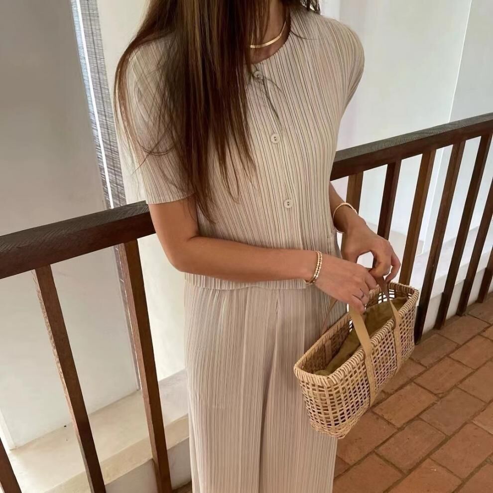 壓褶條紋短袖上衣+ 高腰褲 (2件組)