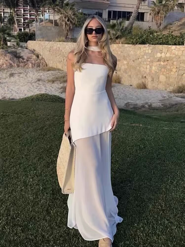 假2件 網紗裙襬平口洋裝(黑/白/咖)