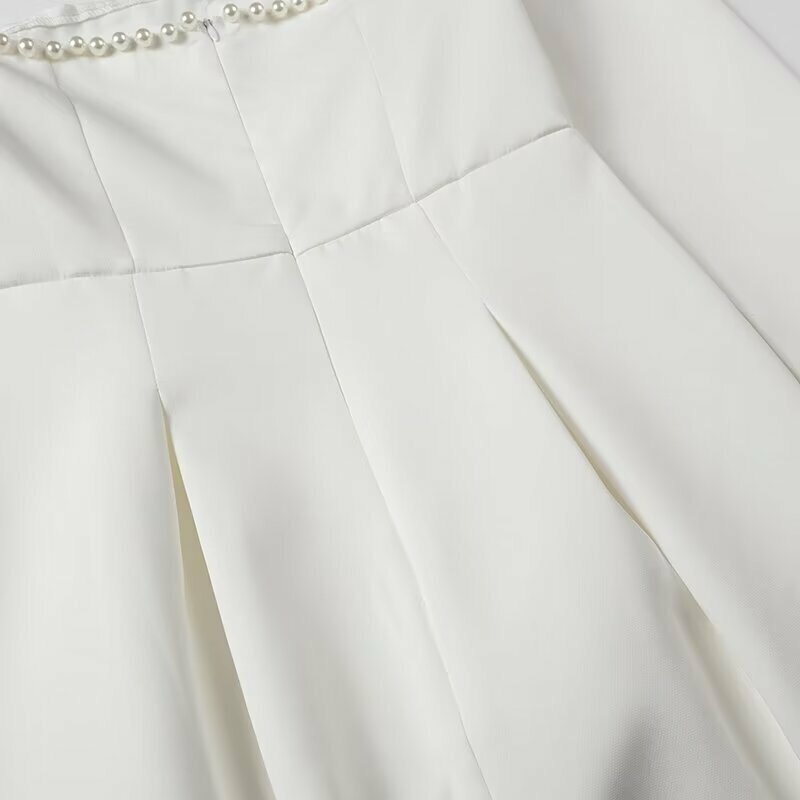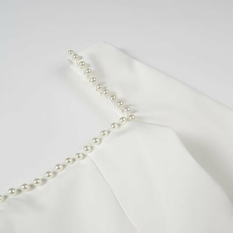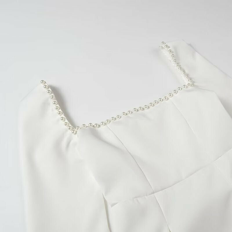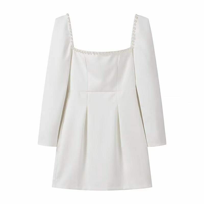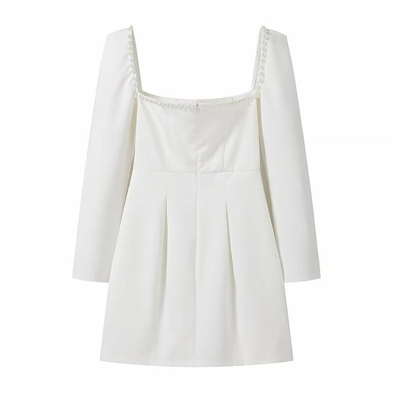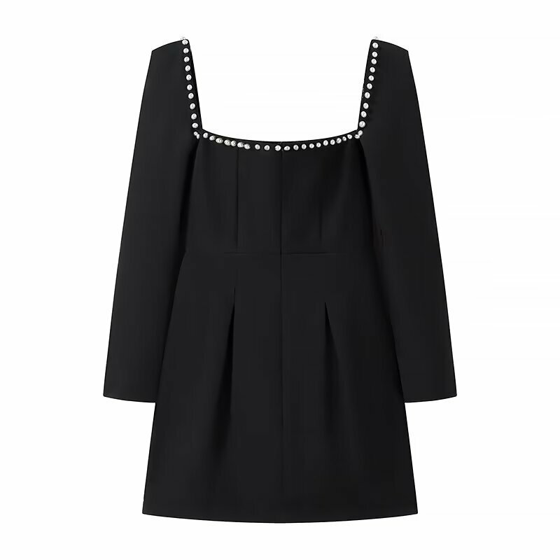 方領珍珠釘珠 收腰小洋裝(黑/白)