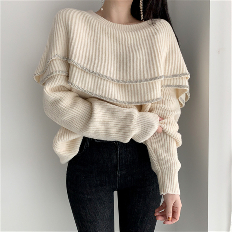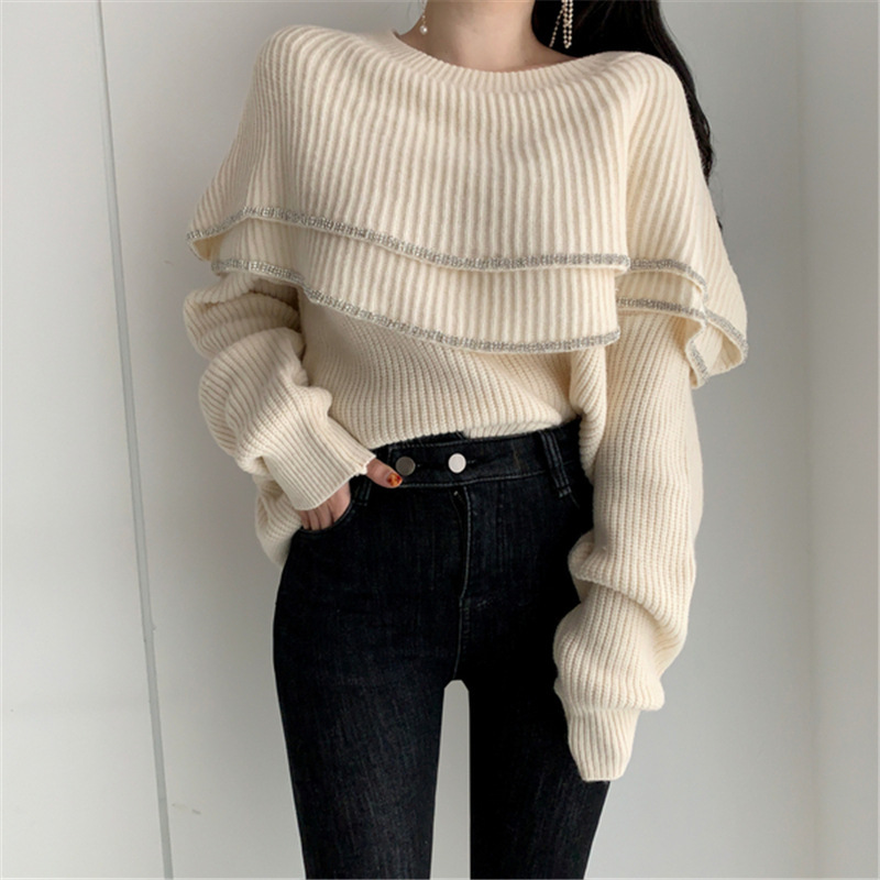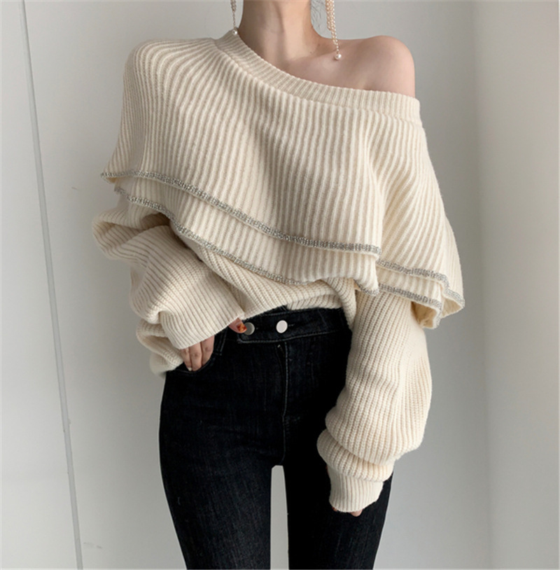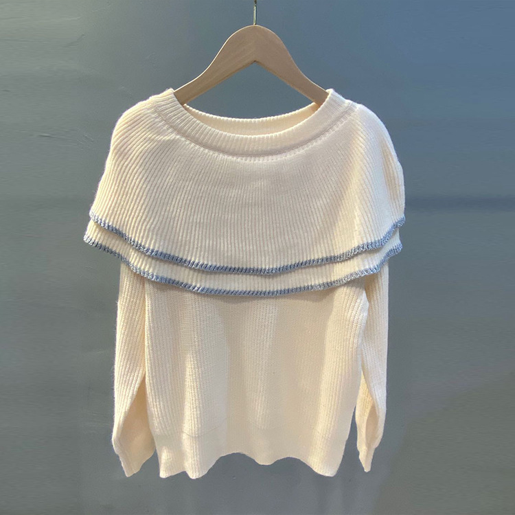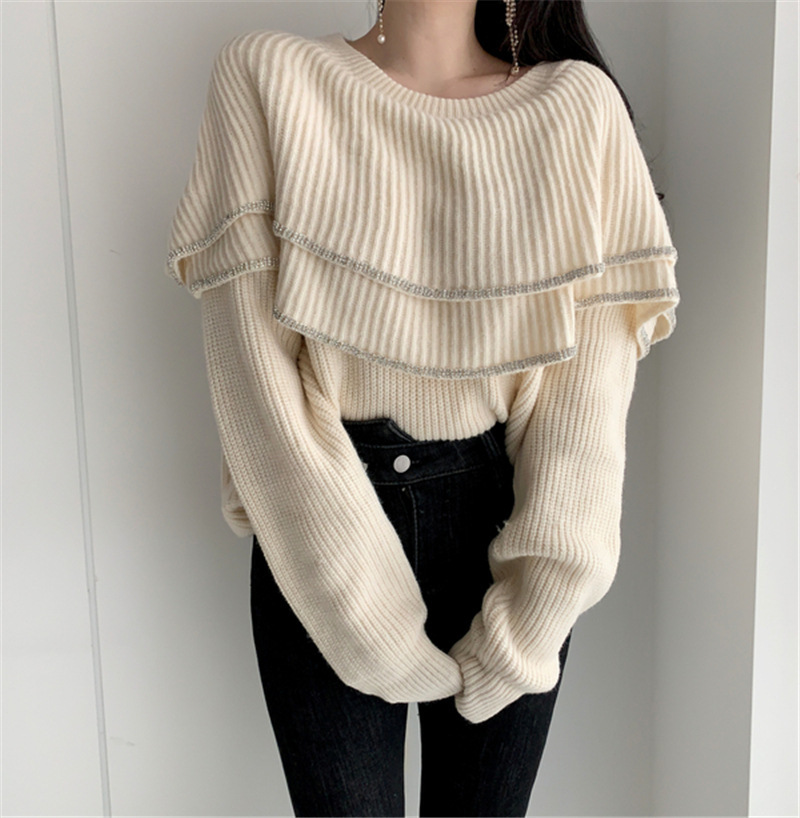 雙層大荷葉 露肩毛衣 (杏/ 黑)
