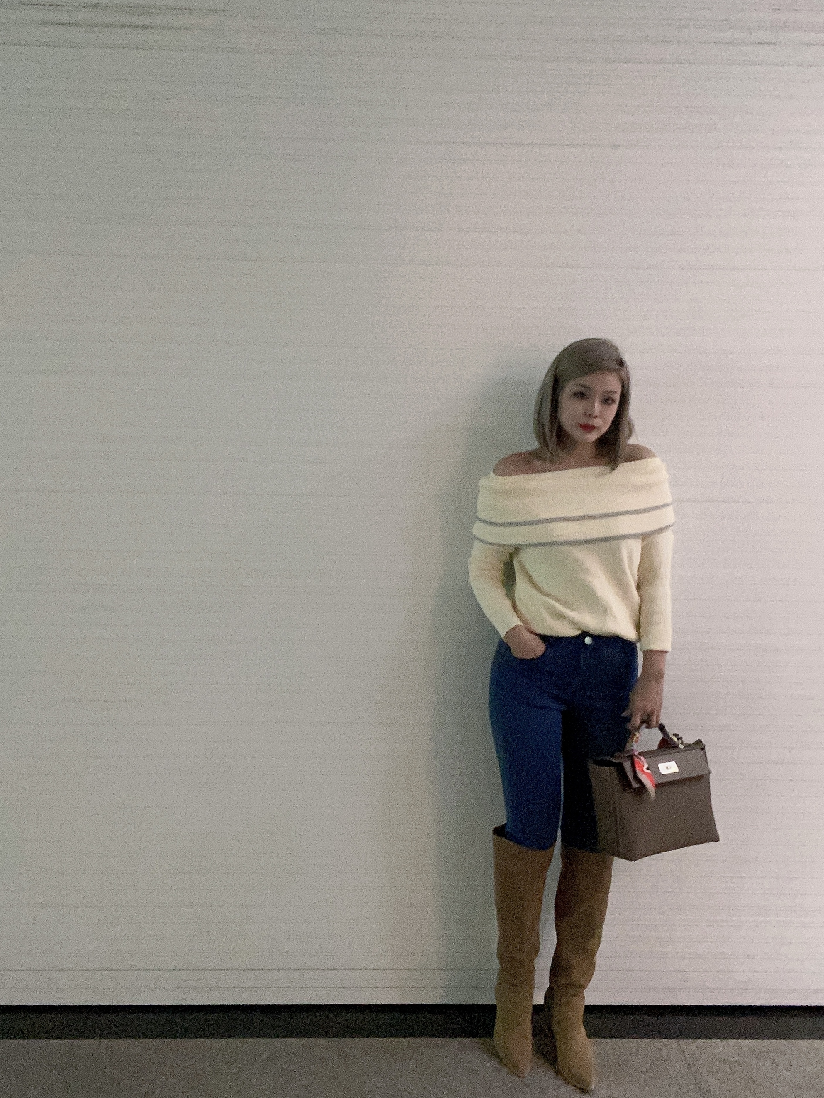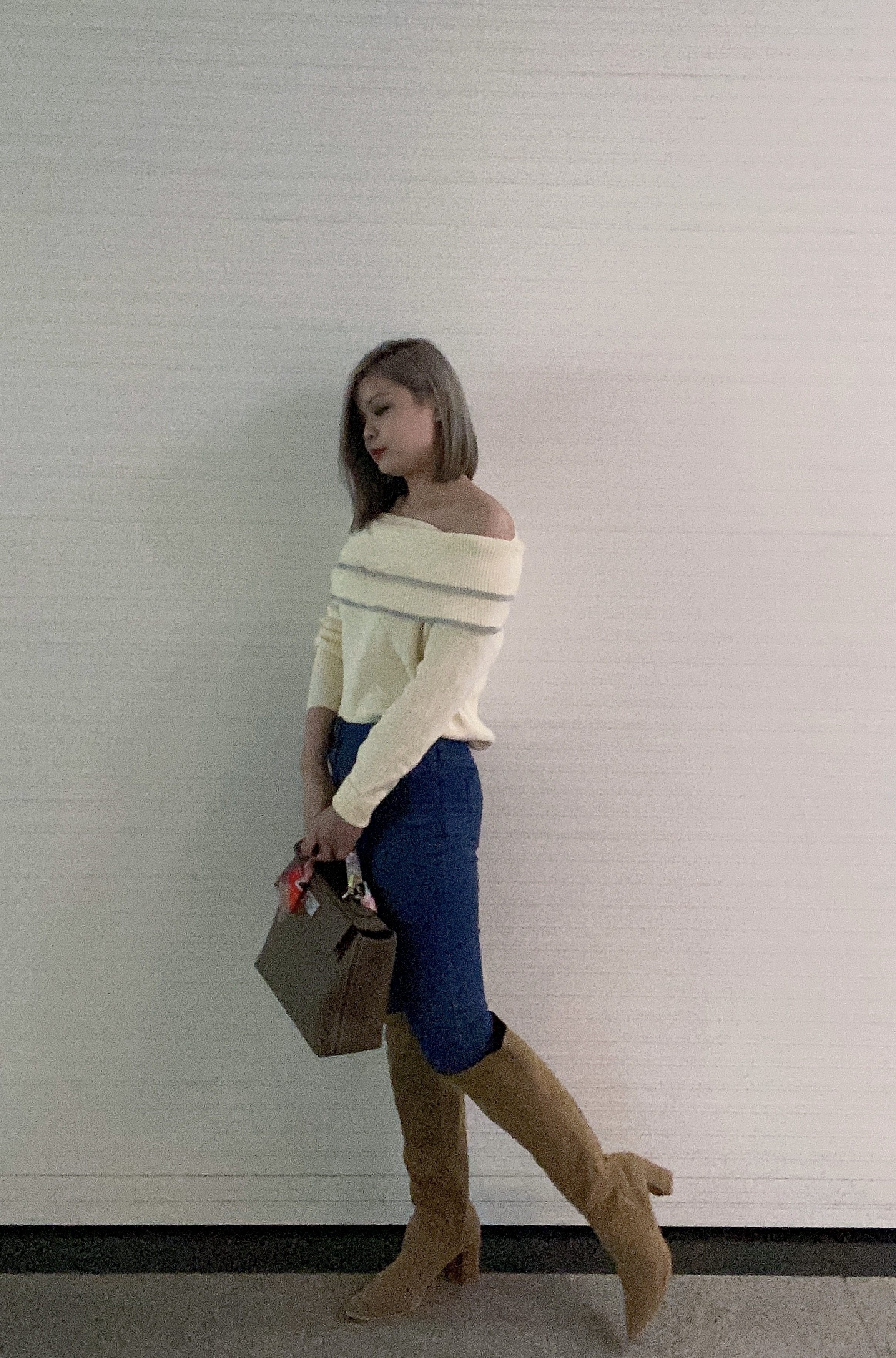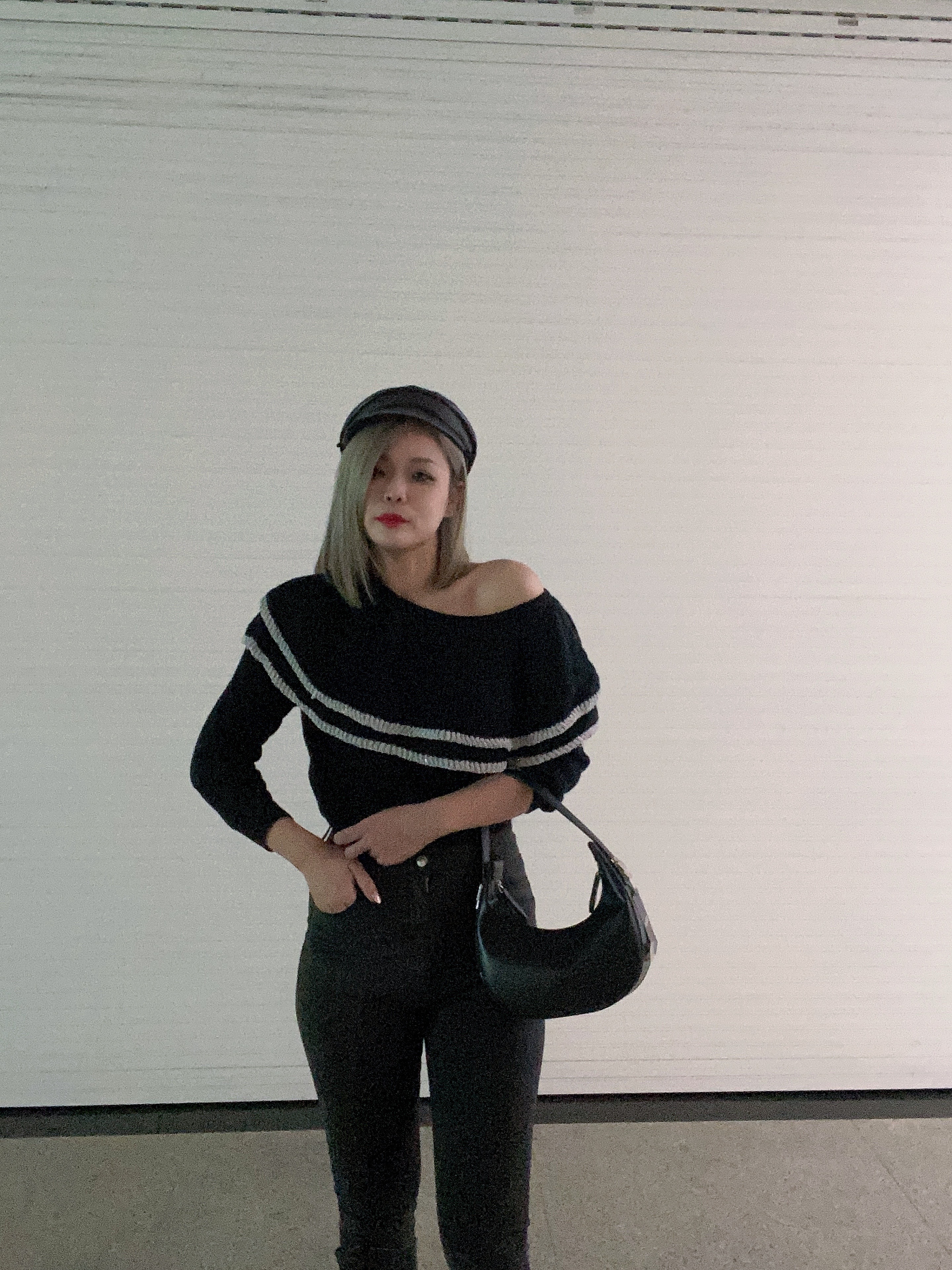 雙層大荷葉 露肩毛衣 (杏/ 黑)