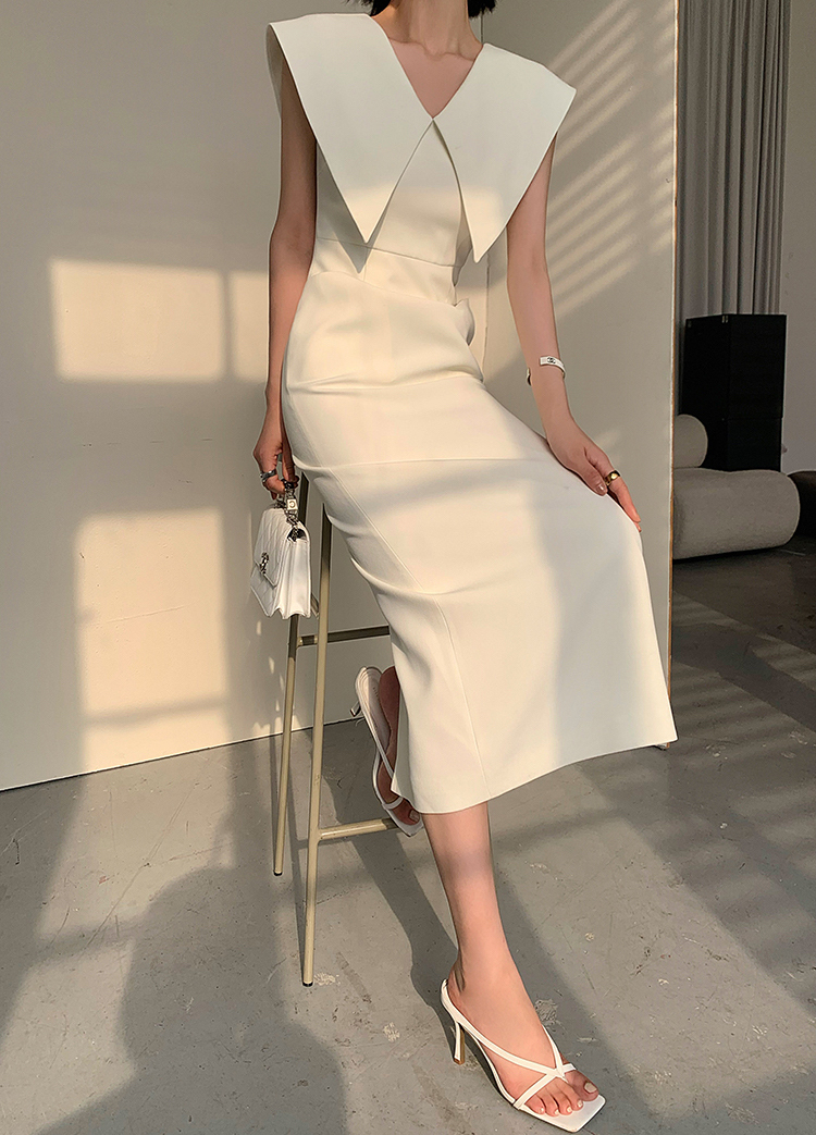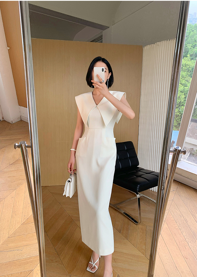 大翻領 赫本風收腰洋裝(黑/白)