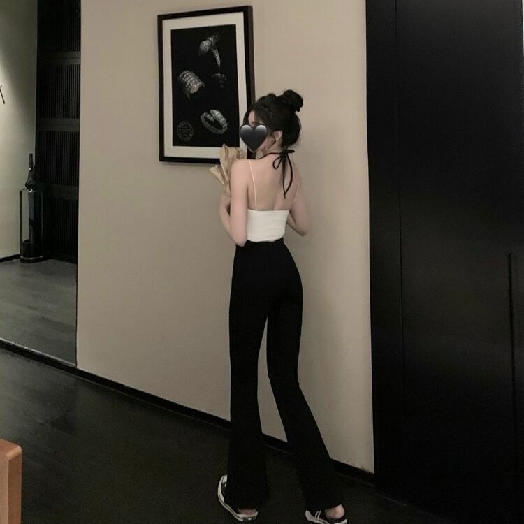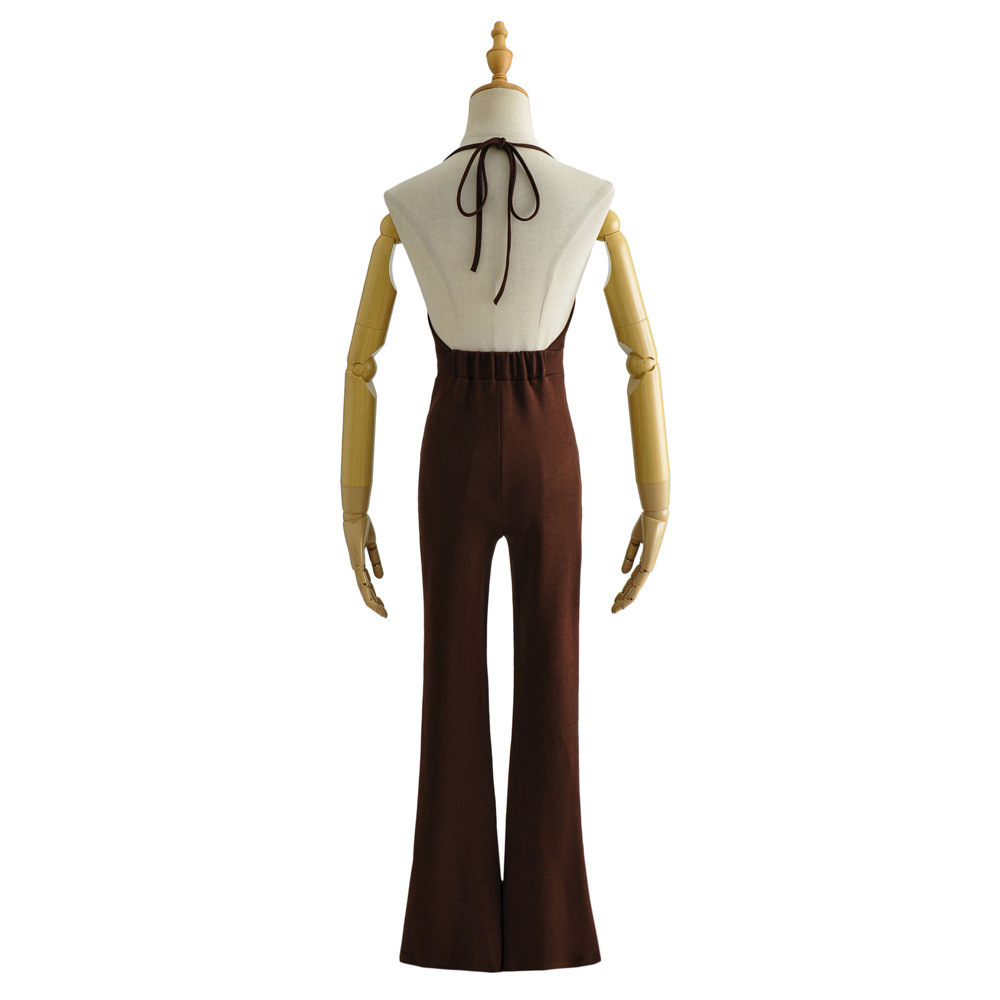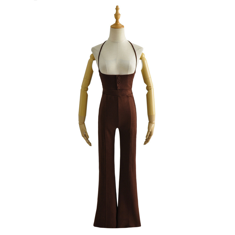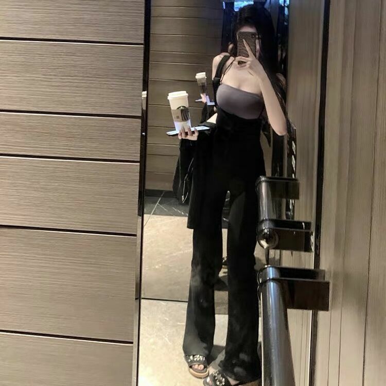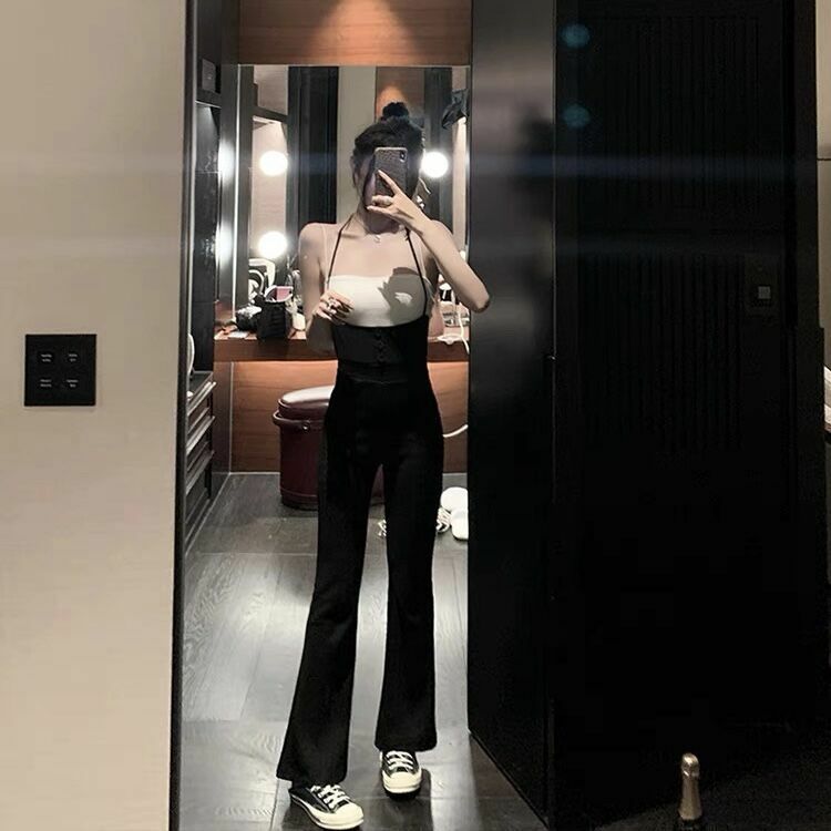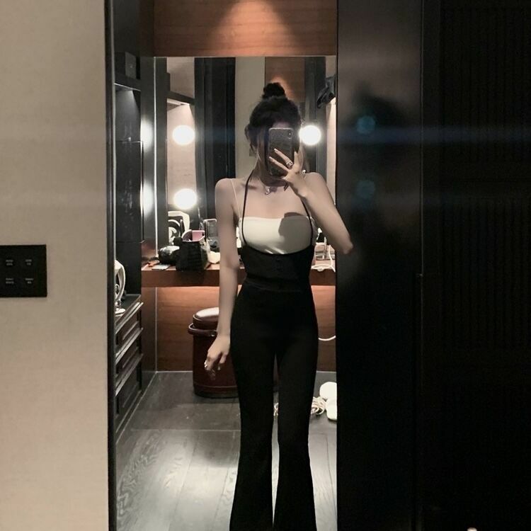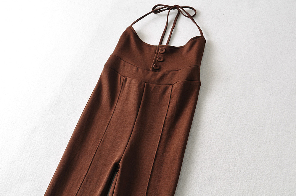 高腰棉質吊帶喇叭褲(黑/咖)