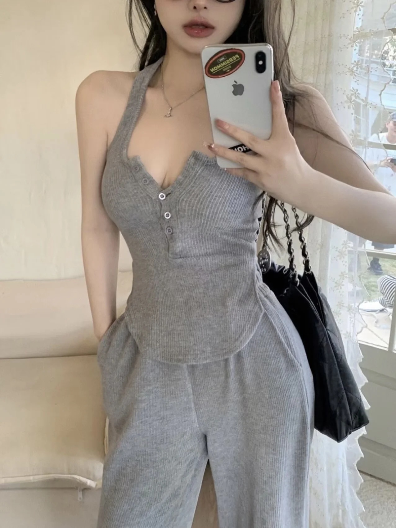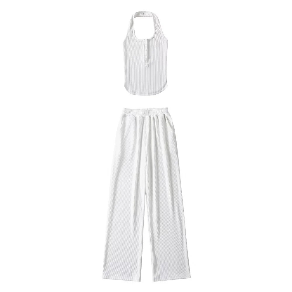 螺紋掛脖上衣+高腰休閒褲(套裝)(黑/白/灰/粉)