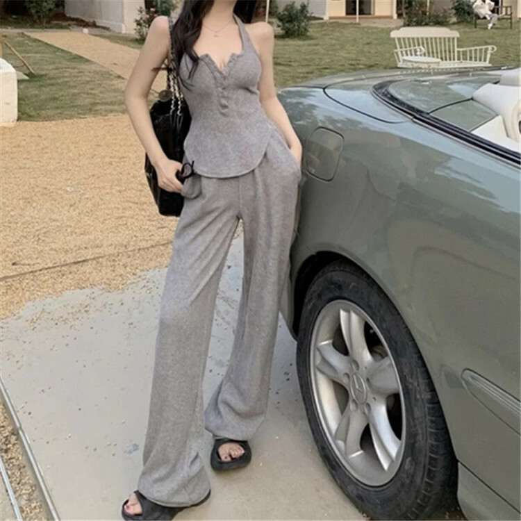 螺紋掛脖上衣採用舒適柔軟的材質,簡約大方的設計,優雅顯瘦。搭配高腰休閒褲,彰顯腰身,營造時尚率性的整體造型。無論上班、外出或是休閒,都能輕鬆駕馭這套優雅亮眼的套裝。黑、白、灰、粉色可供選擇,適合各種膚色和個人風格。