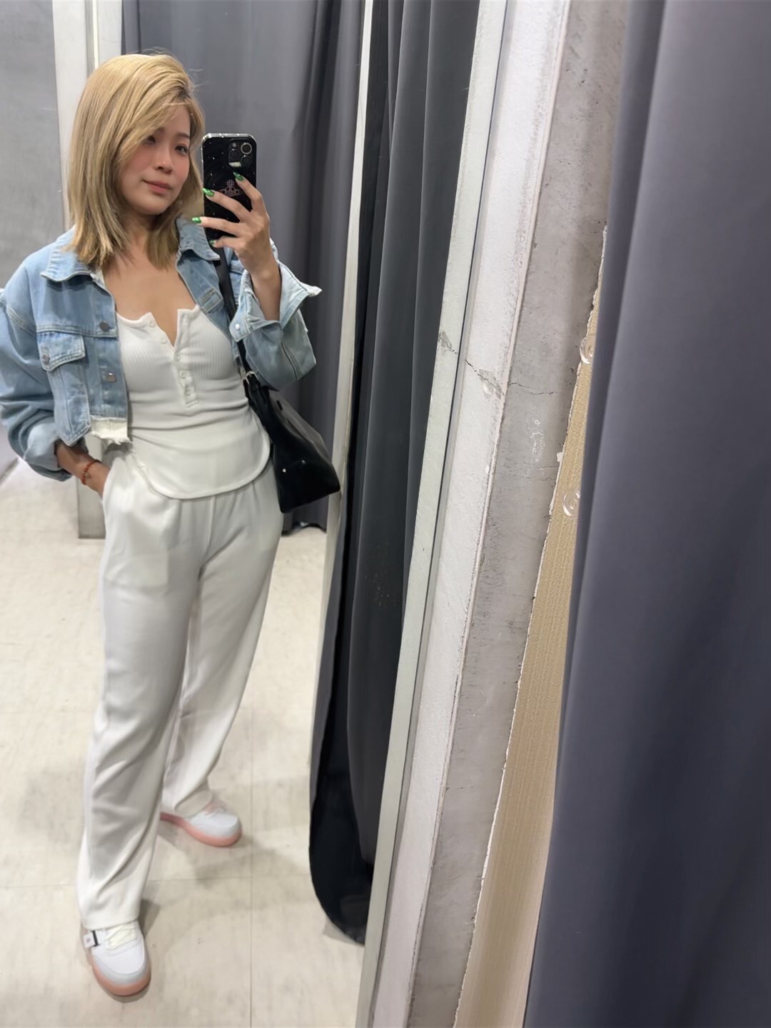 下身為修身顯瘦的高腰剪裁休閒褲款