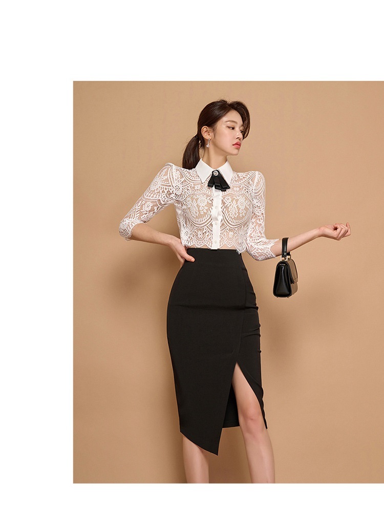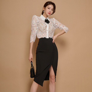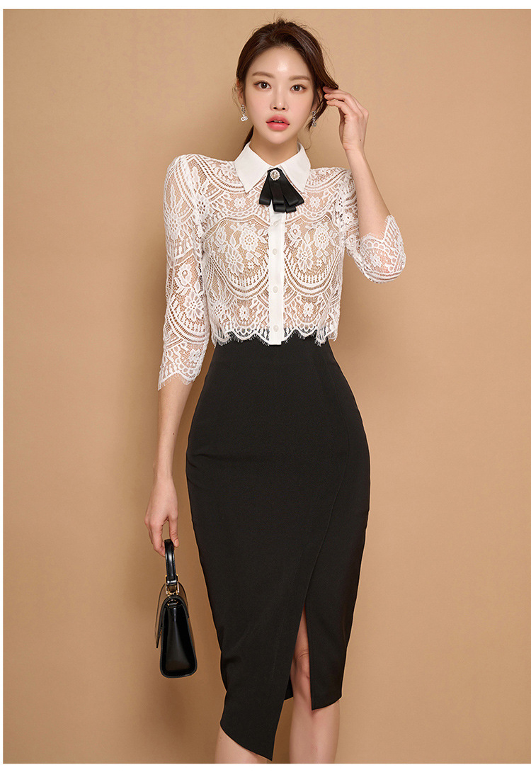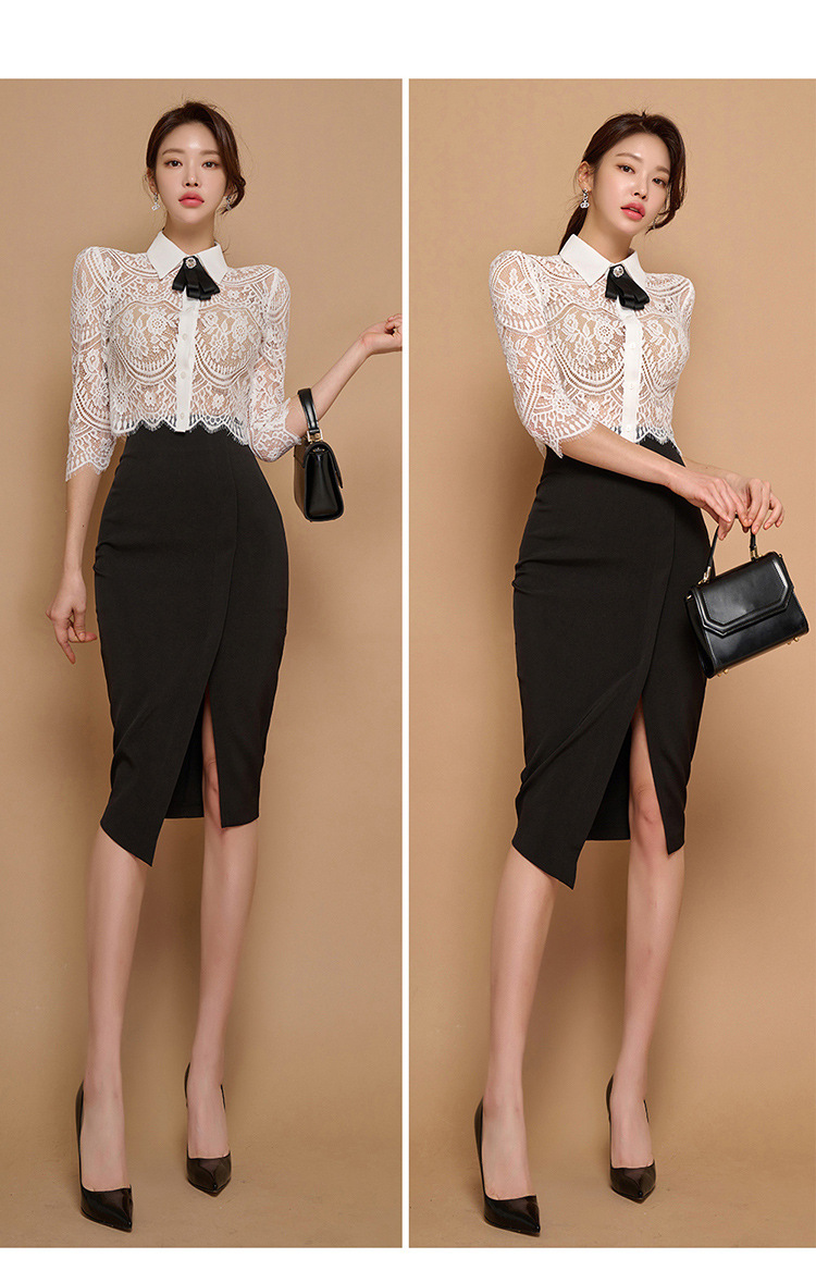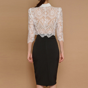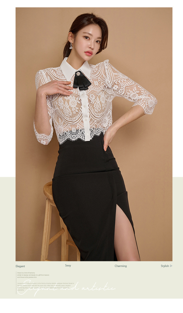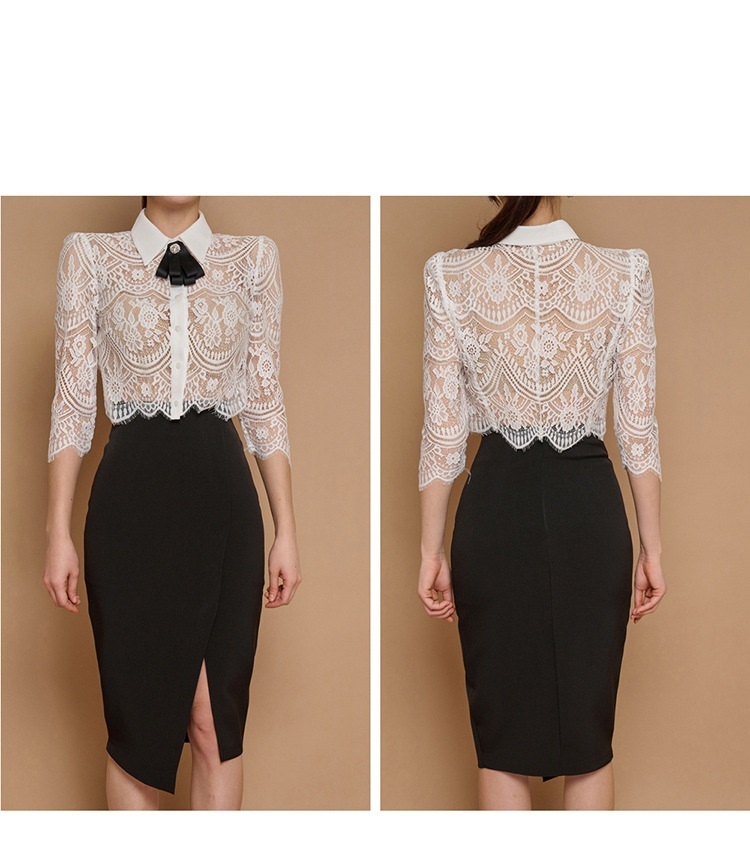 精緻別緻的蕾絲立領,配上優雅高腰裙身,營造出宮廷氣質。面料輕盈舒適,適合各式場合。精細蕾絲工藝,鏤空設計極具女性優雅風韻。高腰剪裁修飾腰身,展現曲線迷人風采。兩件組搭配便利,還能靈活變化造型。