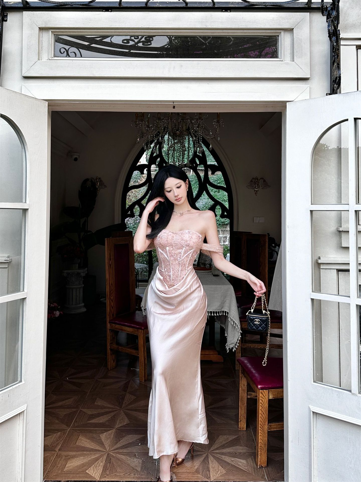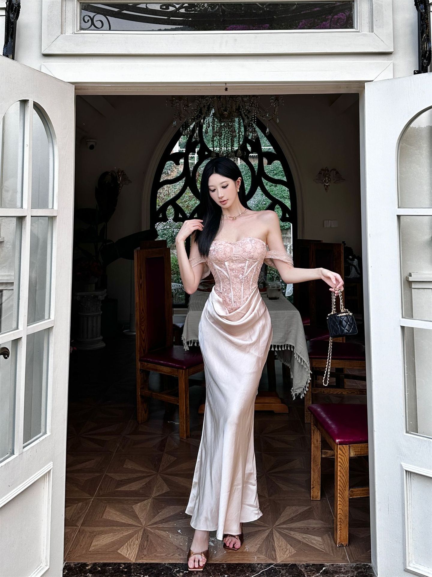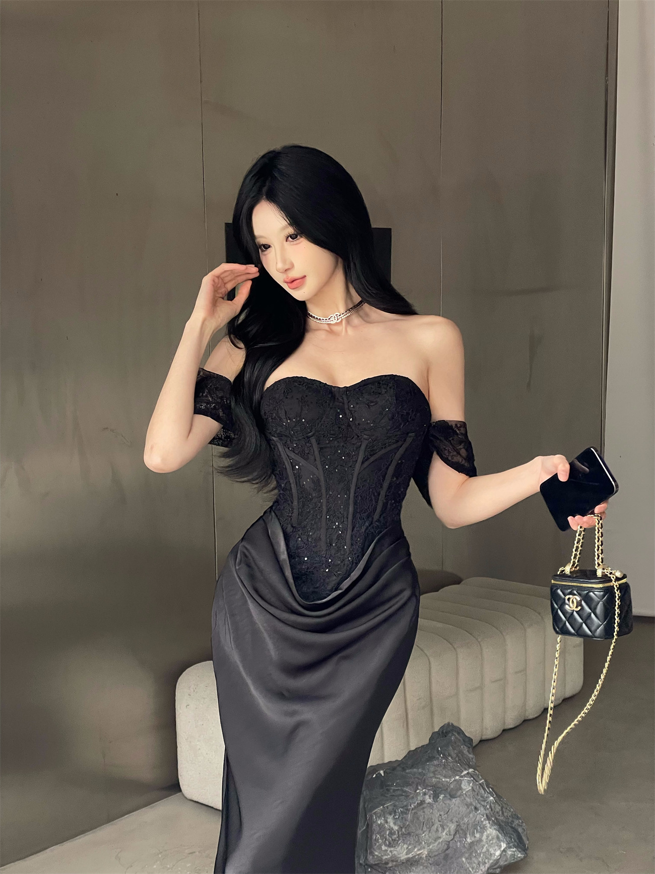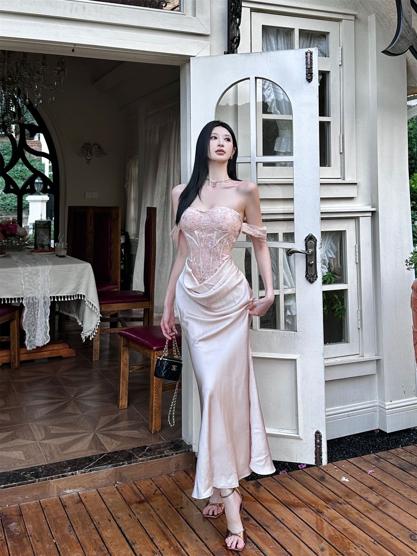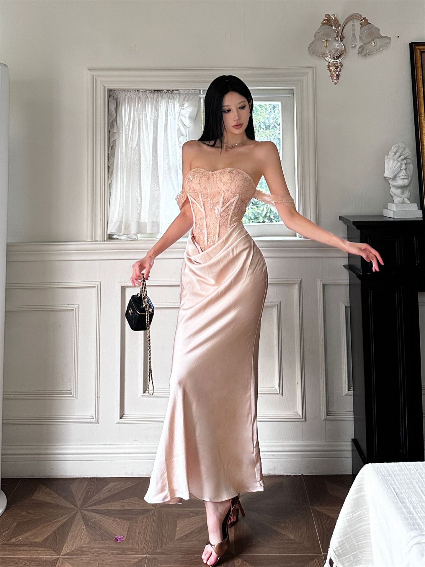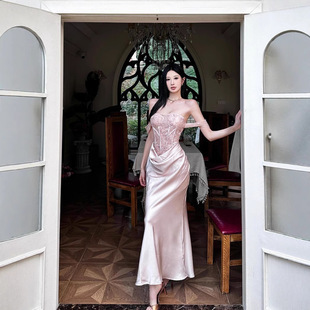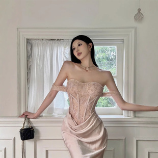 垂墜緞面裙襬 平口馬甲禮服(黑/裸粉)