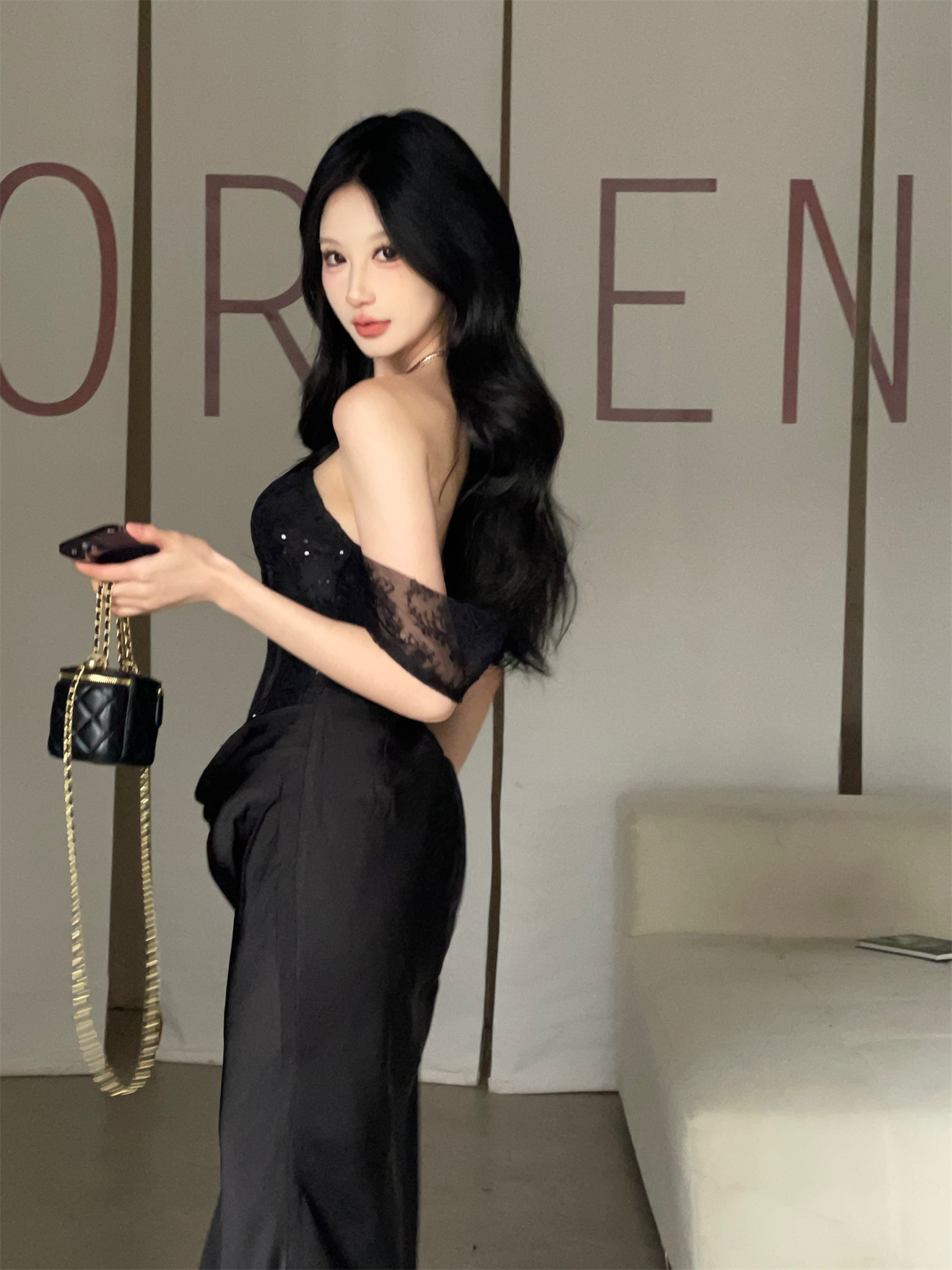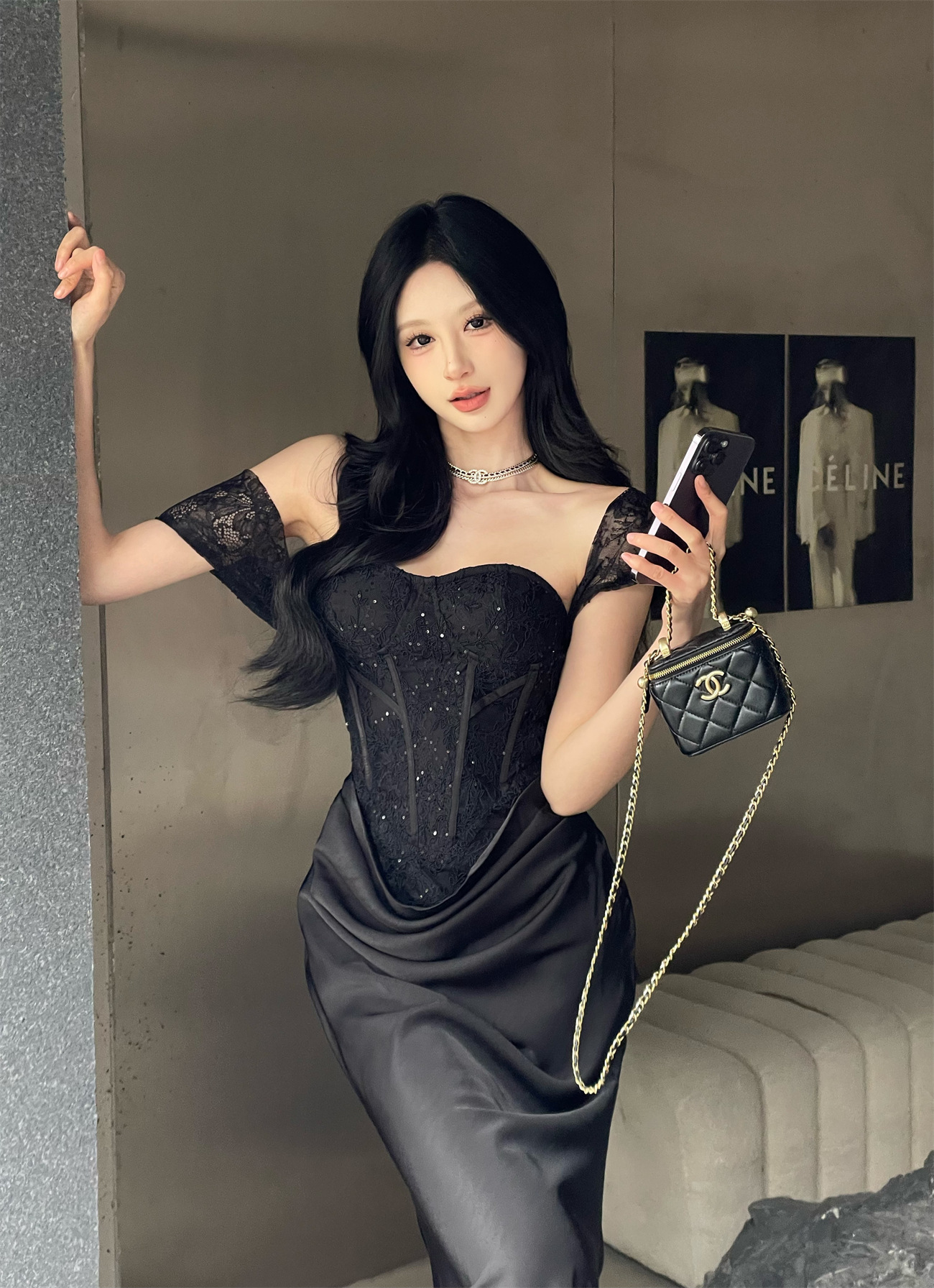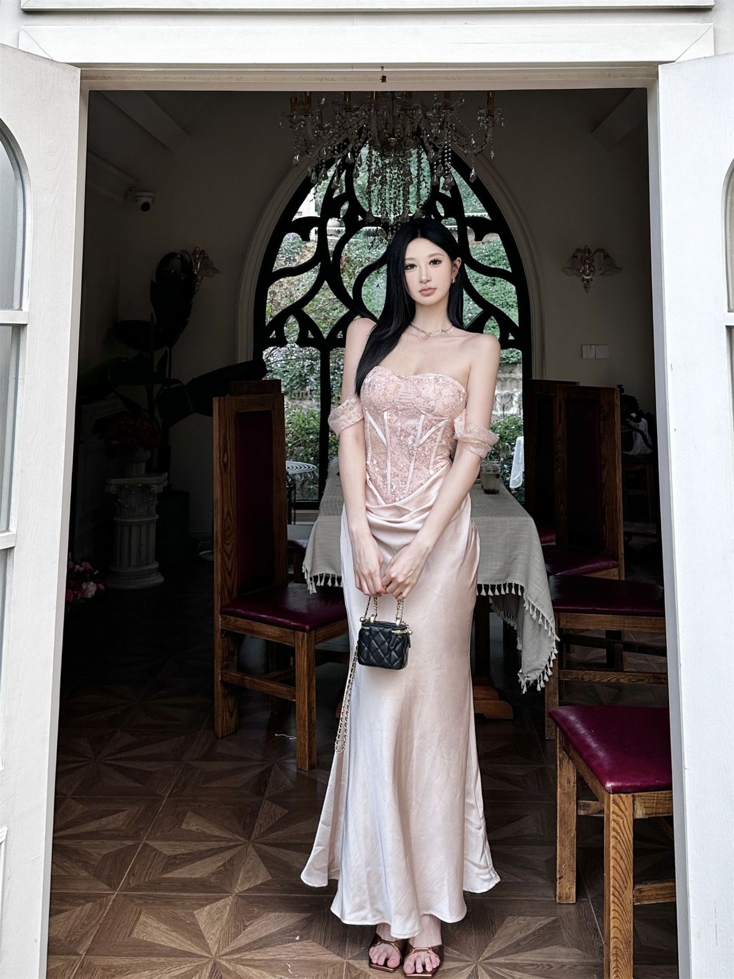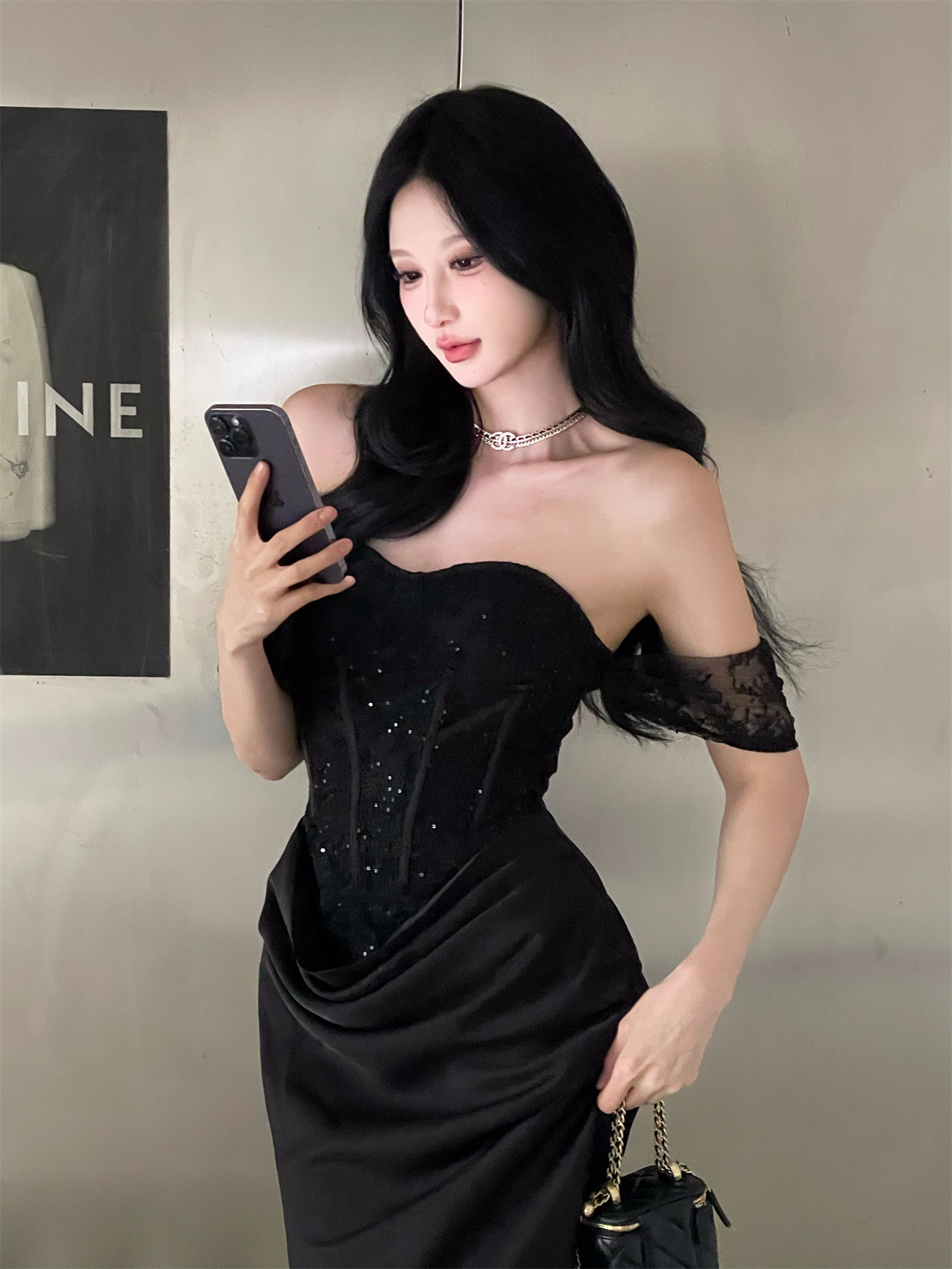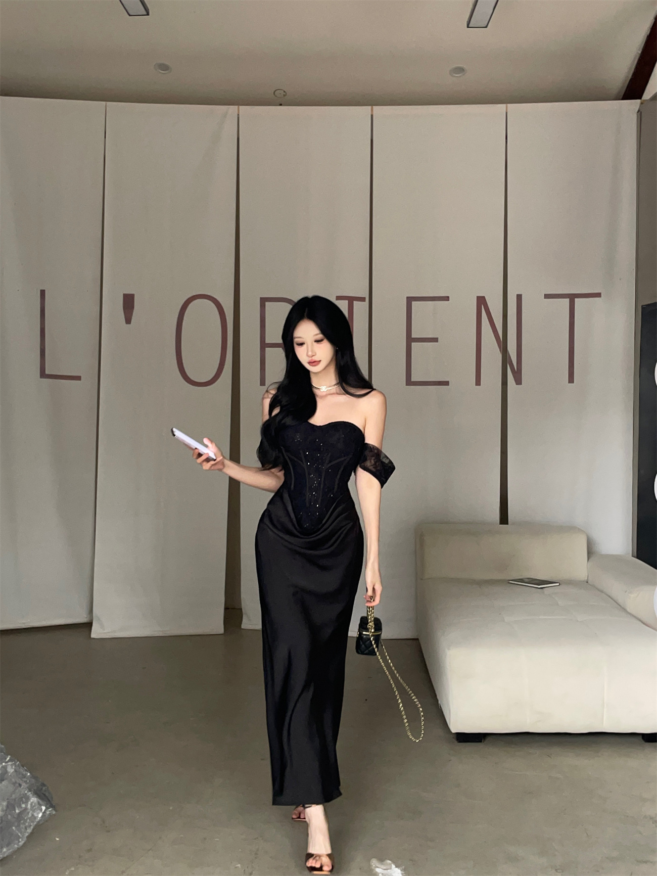 垂墜緞面裙襬 平口馬甲禮服(黑/裸粉)