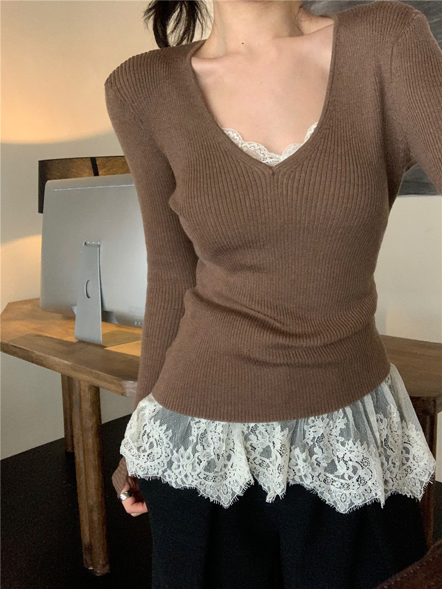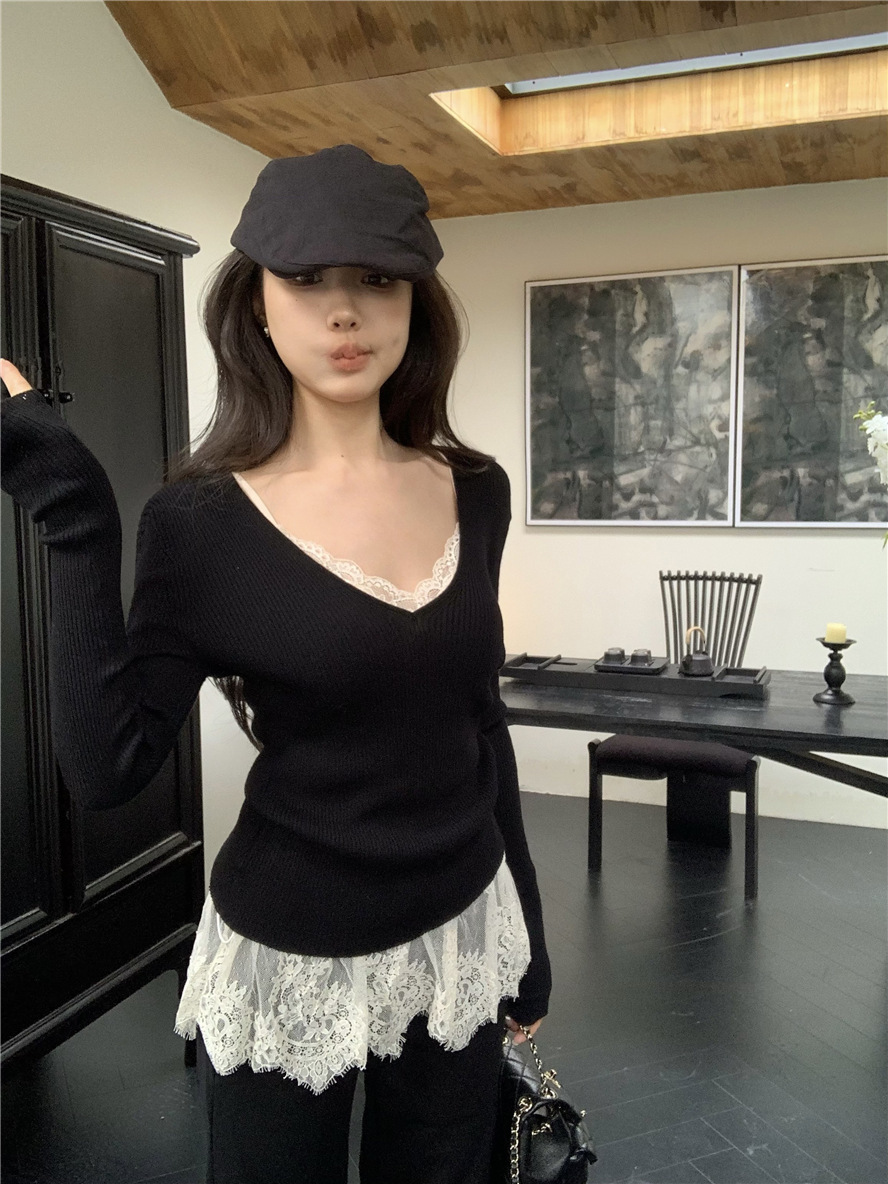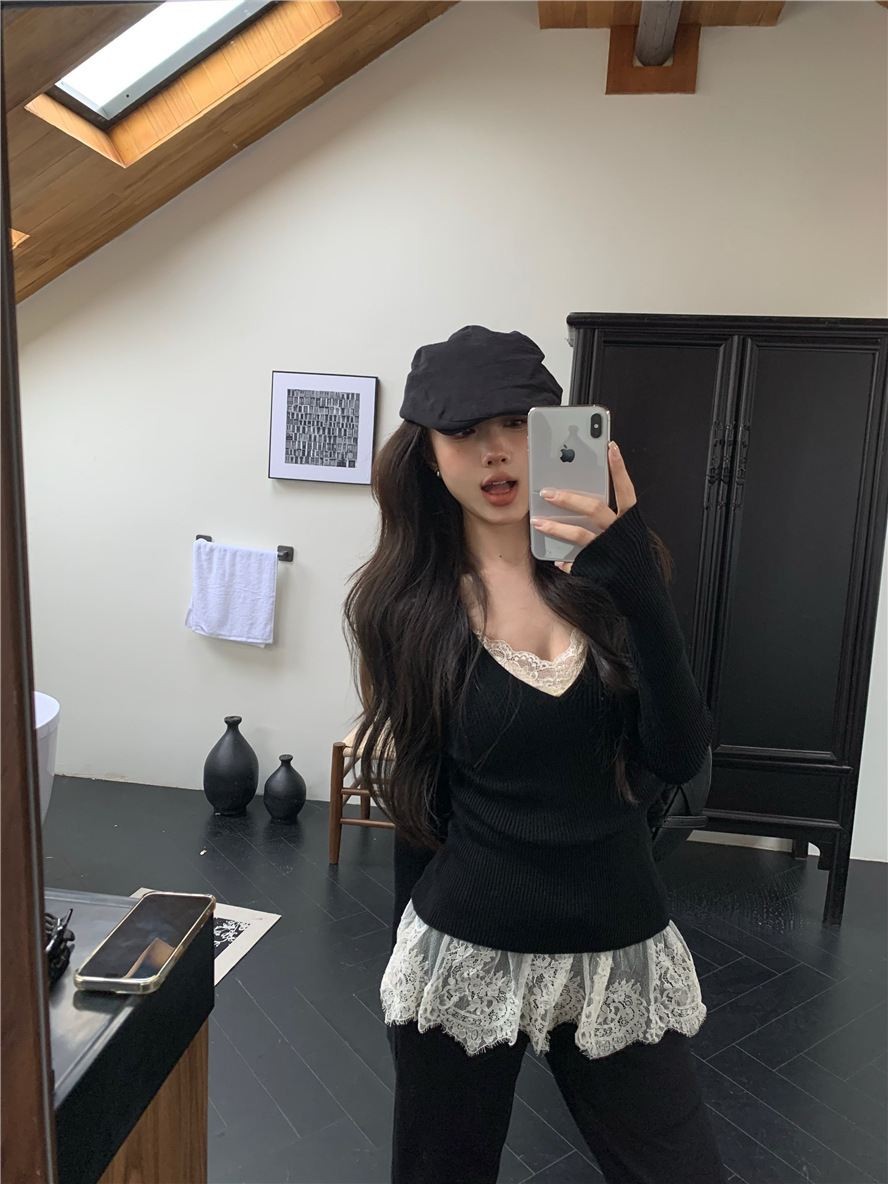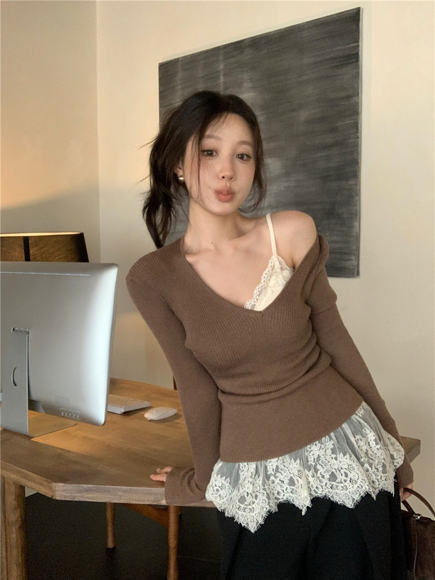 睫毛蕾絲 罩杯細肩帶+V領針織上衣(2件組)