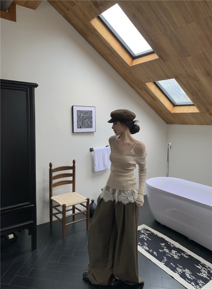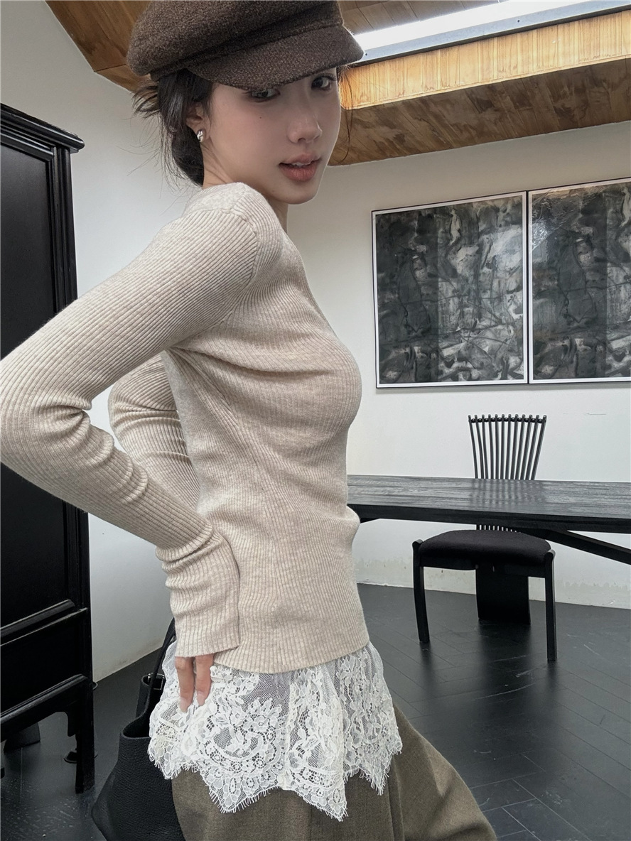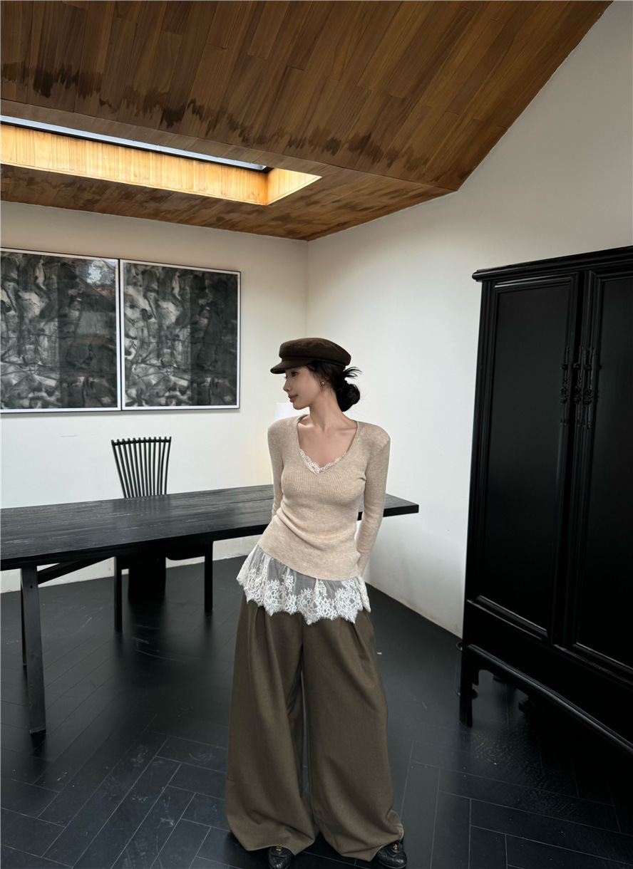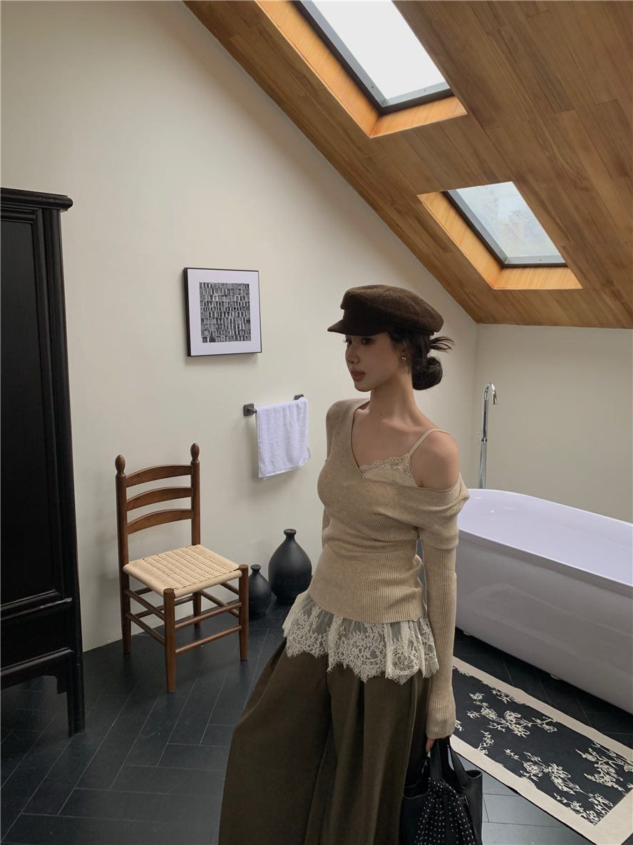 睫毛蕾絲 罩杯細肩帶+V領針織上衣(2件組)