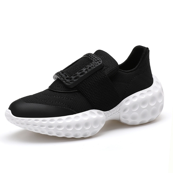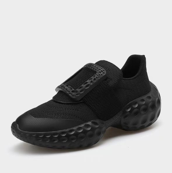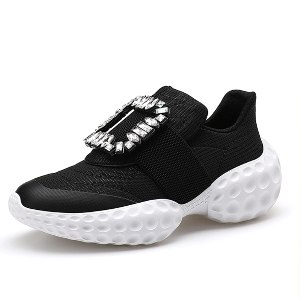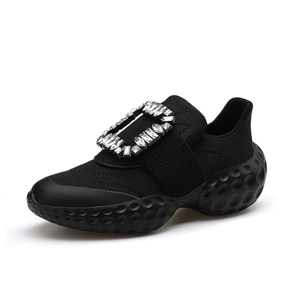 水鑽方釦增添設計感。 全黑顏色極具時尚感。 厚實鞋底提供良好緩震支撐。 彈性網布材質舒適透氣。 適合多種場合穿搭。