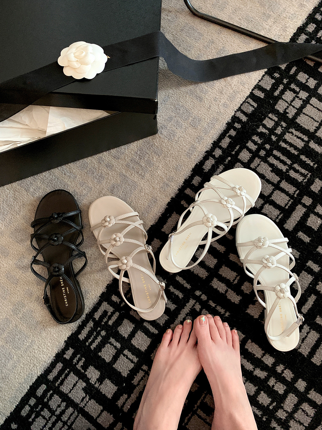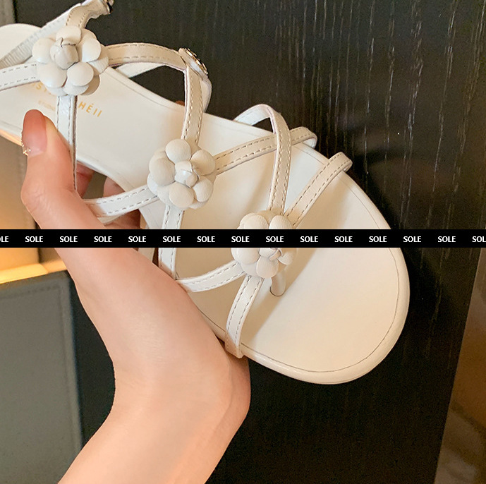 立體山茶花 真皮羅馬涼鞋(34-40)(黑/白/灰)