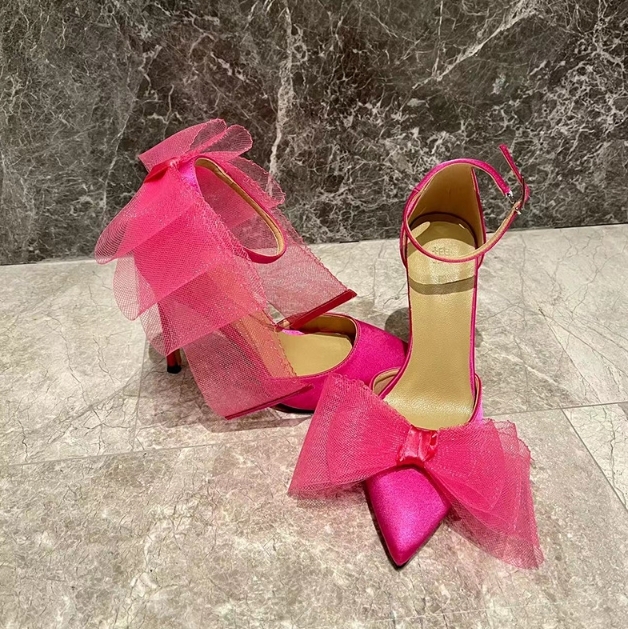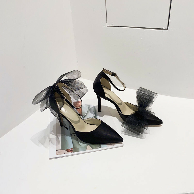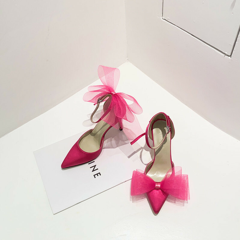 不對稱網紗大蝴蝶結 尖頭跟鞋(35-40)(黑/桃粉)