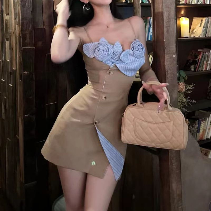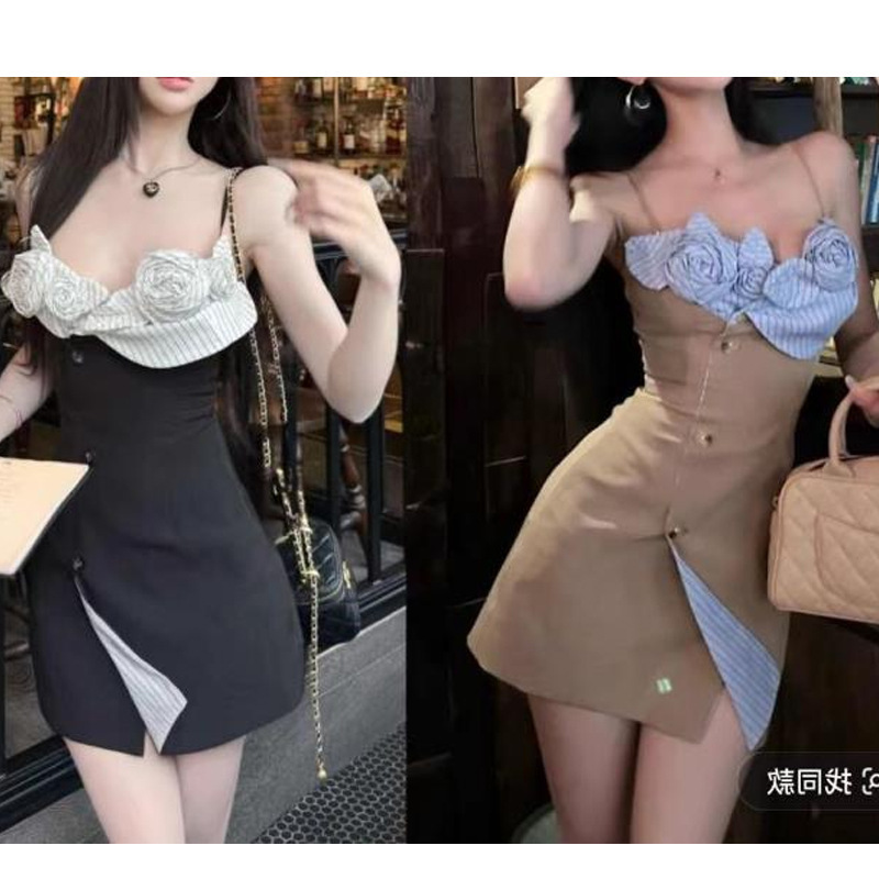 立體山茶花 收腰小洋裝(奶茶/黑)