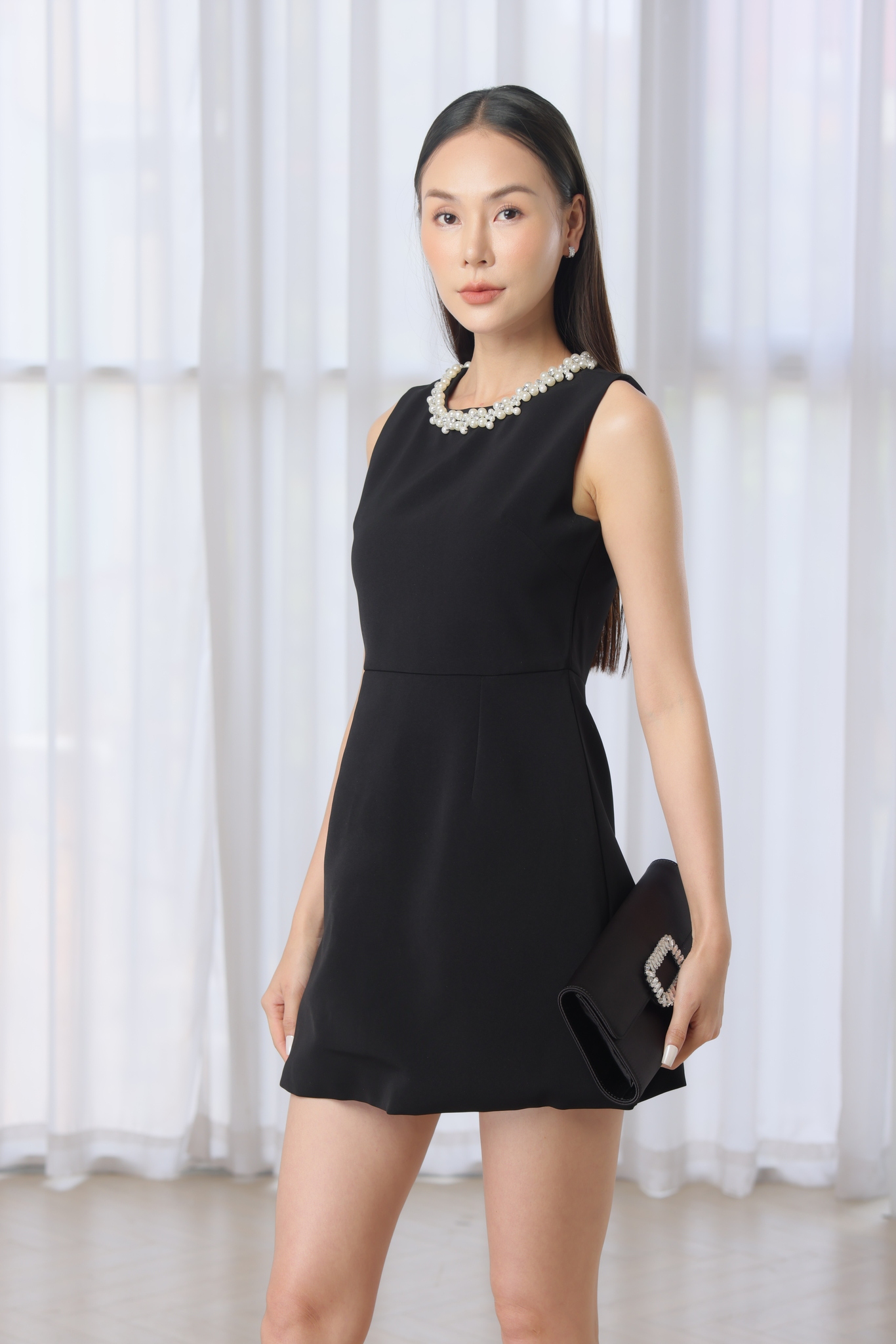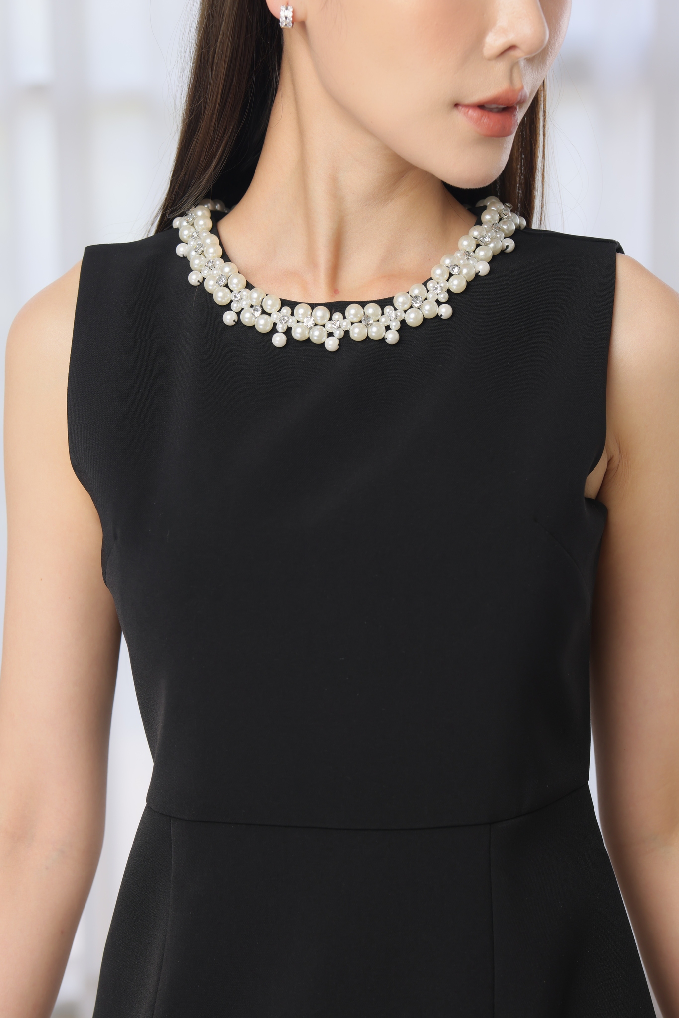 這件黑色無袖小洋裝散發著時尚優雅的氣質。領口華麗的珍珠點綴增添了典雅的細節,彰顯了優雅御姐風範。蓬鬆的裙擺版型剪裁恰到好處,修飾身形輪廓。無論是出席正式場合或是日常郊遊,都能展現迷人的時尚女性風采。