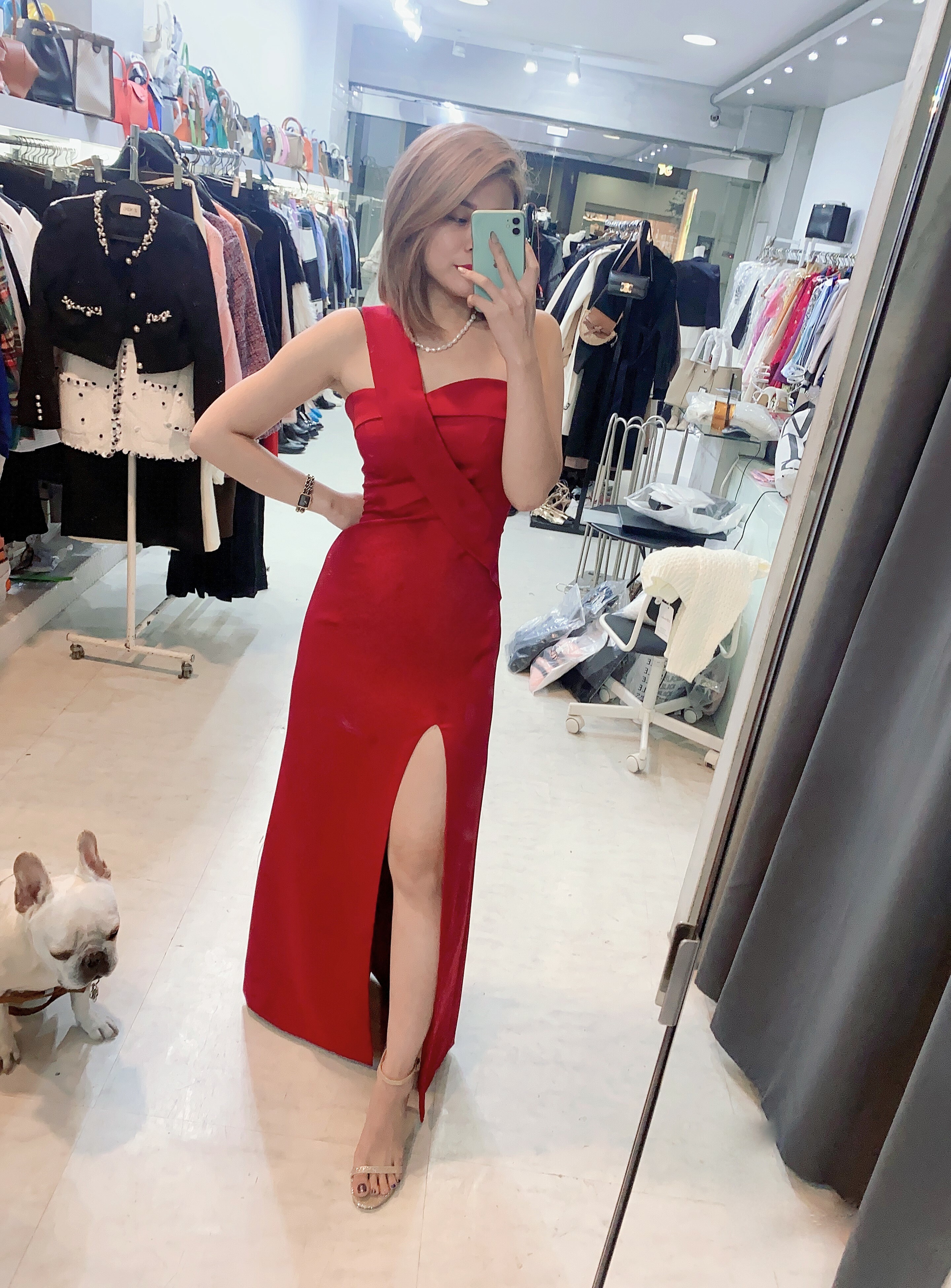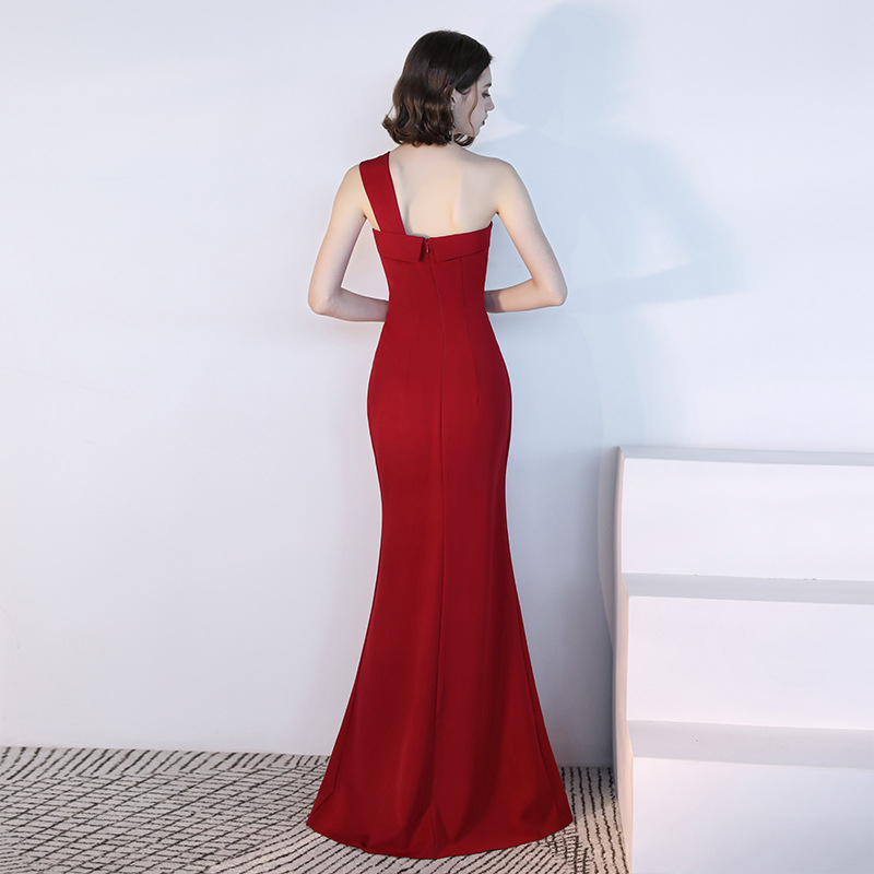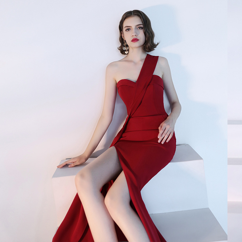 單肩開衩 素色長洋裝(黑/紅)