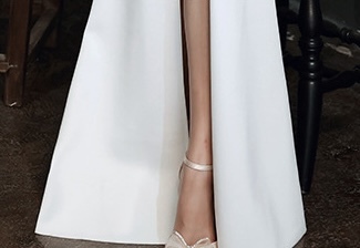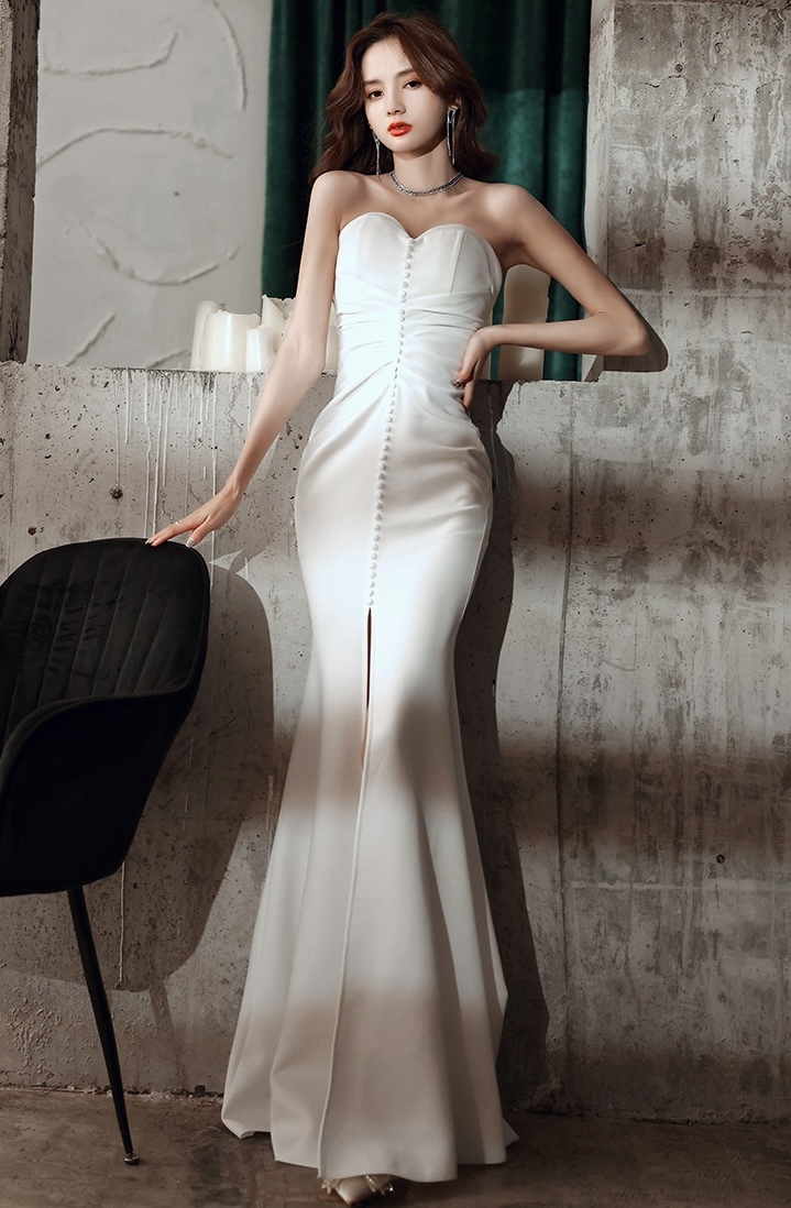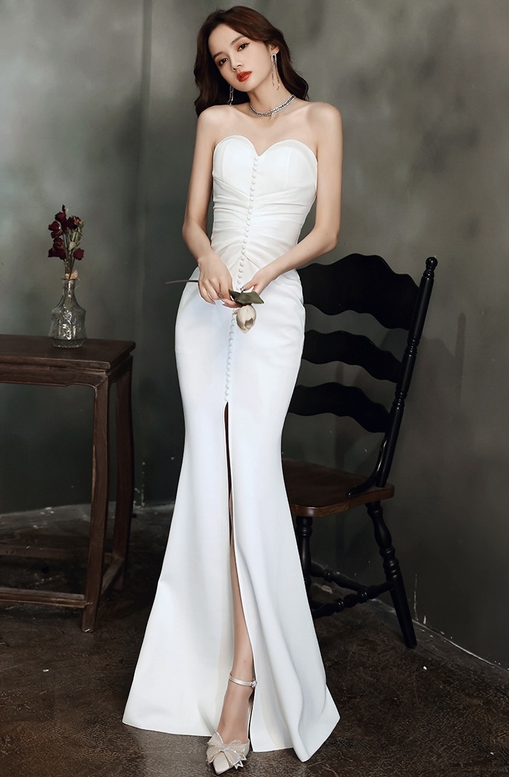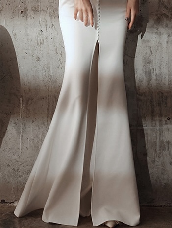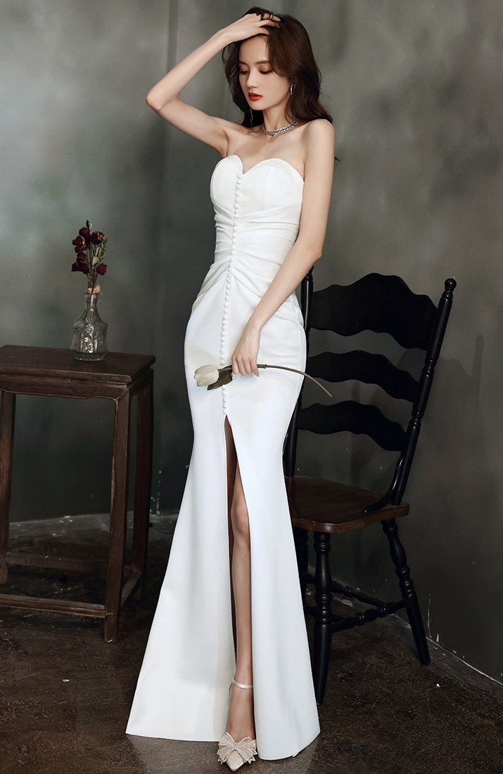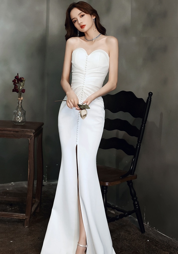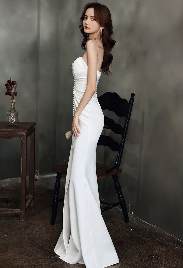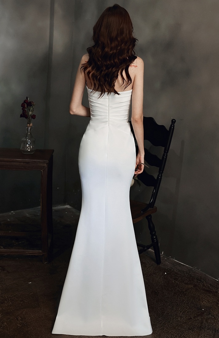 纖細剪裁,流線型設計, 凸顯優雅氣質。裙擺泰到膝蓋處,流暢的魚尾線條使穿著更顯修長。鍍鑽壓褶特別彰顯禮服的層次感。優雅專屬,適合各式正式場合,成為晚宴焦點。