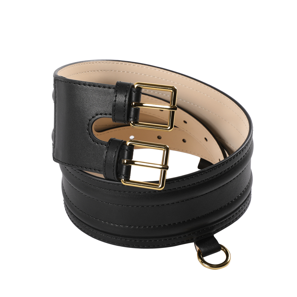 這款牛皮寬皮帶採用真皮材質,質感優良。設計有雙釦環裝飾,增添時尚元素。