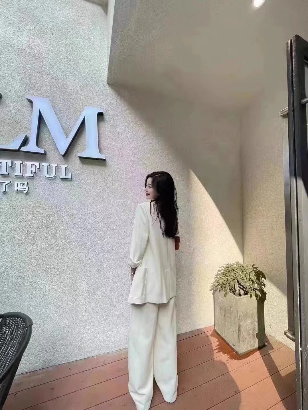 簡約的西裝外套搭配寬鬆的九分西裝褲,剪裁俐落的設計展現優雅氣質。