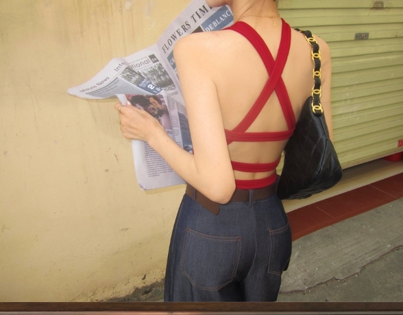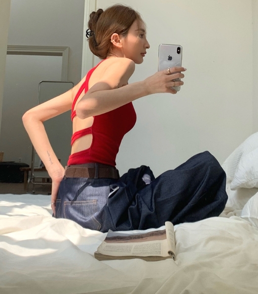 線條露背 合身上衣(紅/黑)