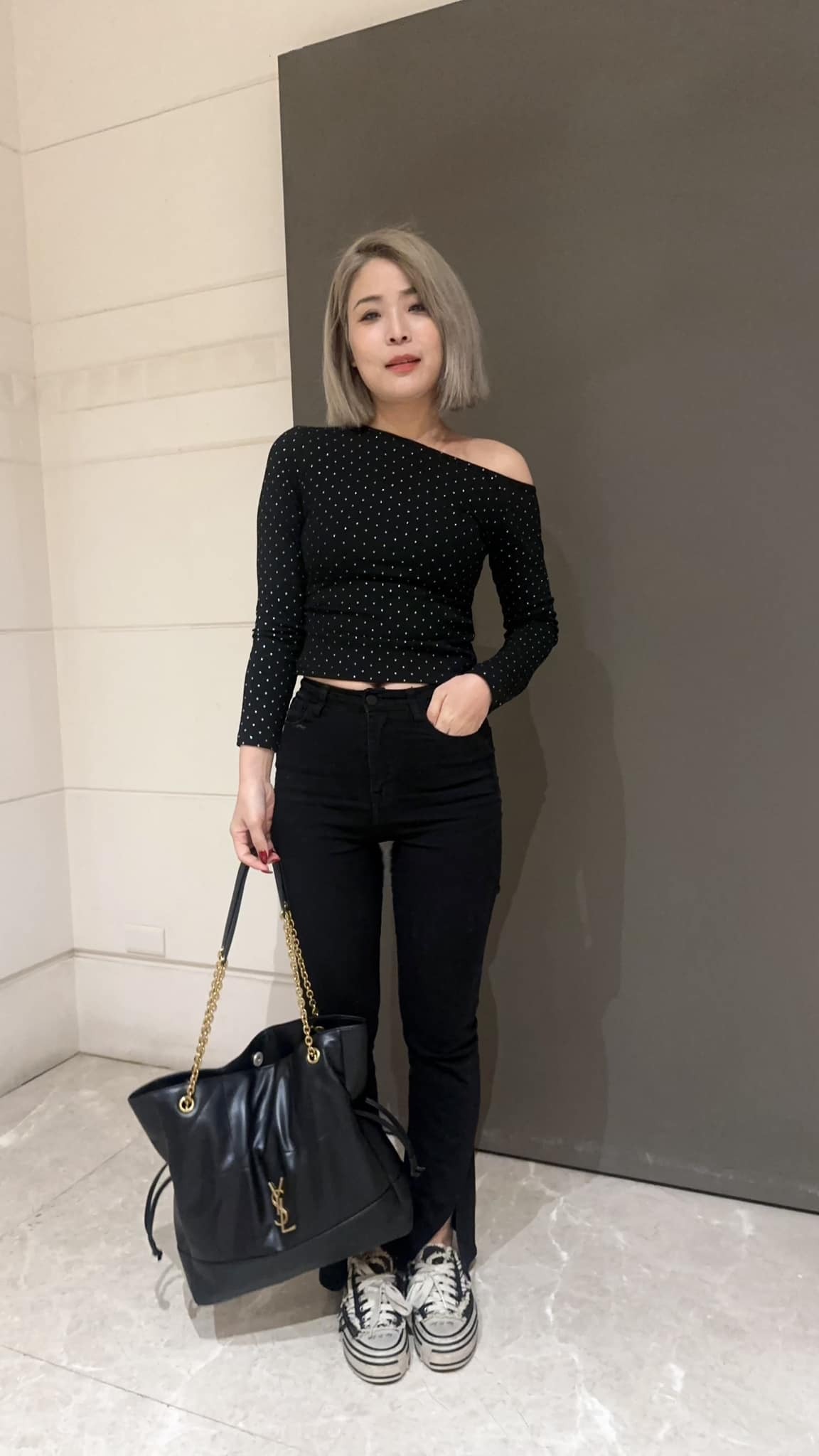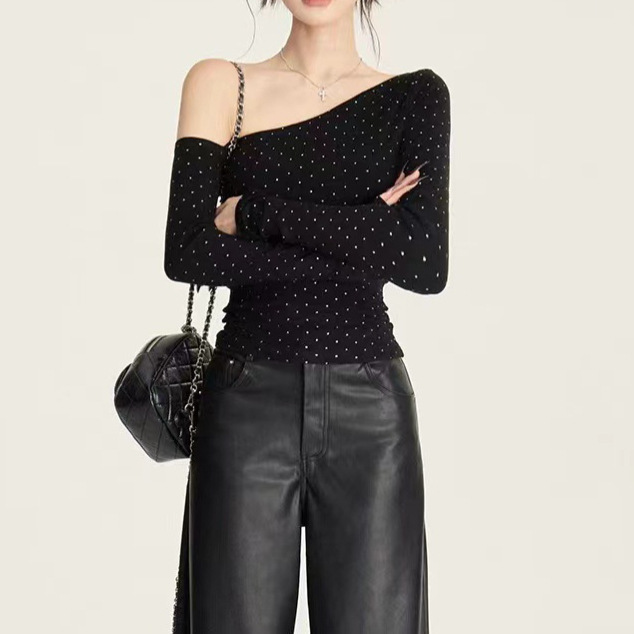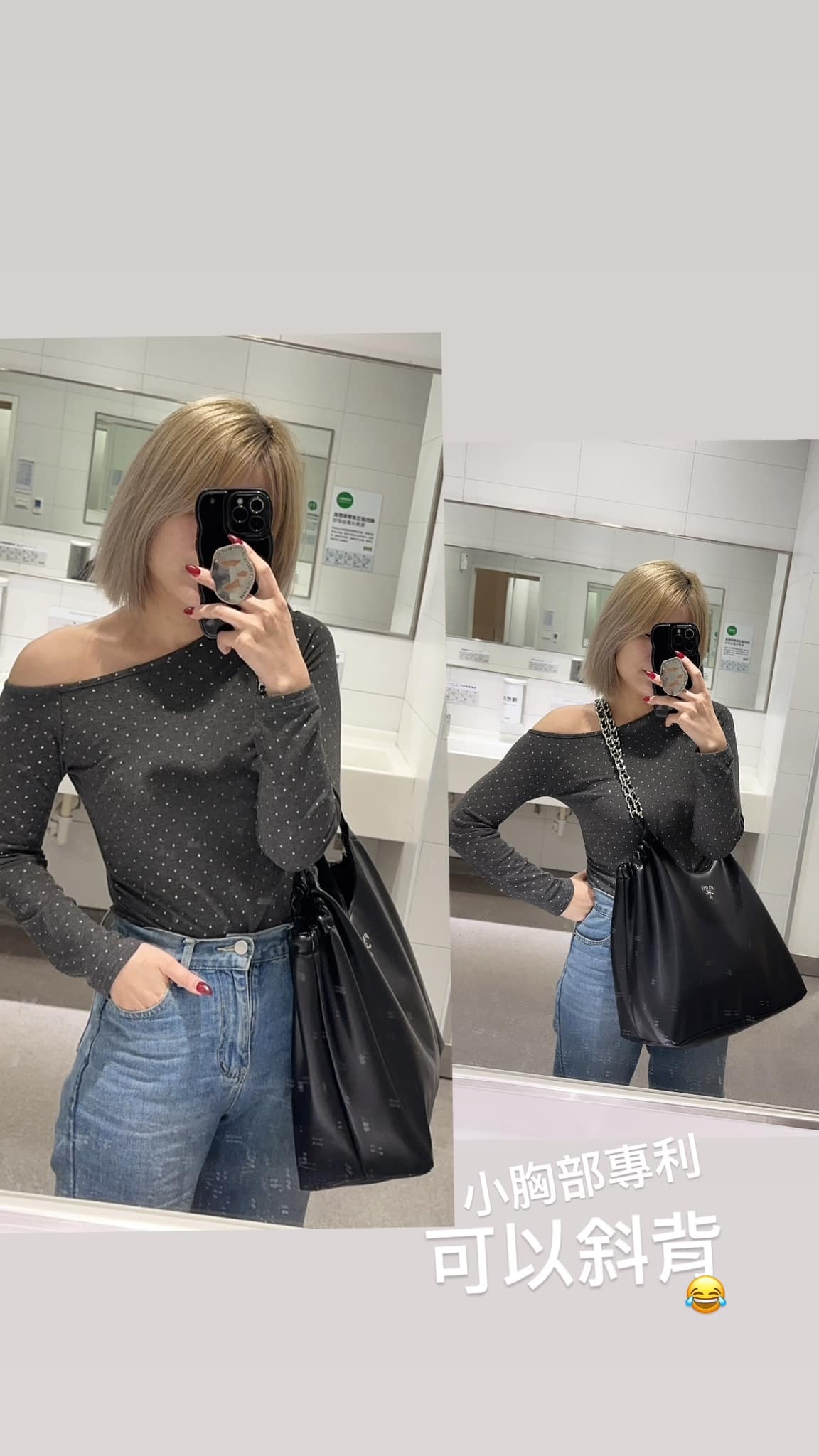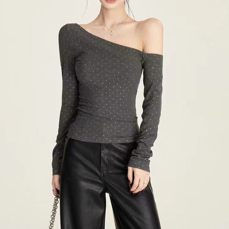 閃粉波點斜肩 棉質長袖上衣(黑/灰)