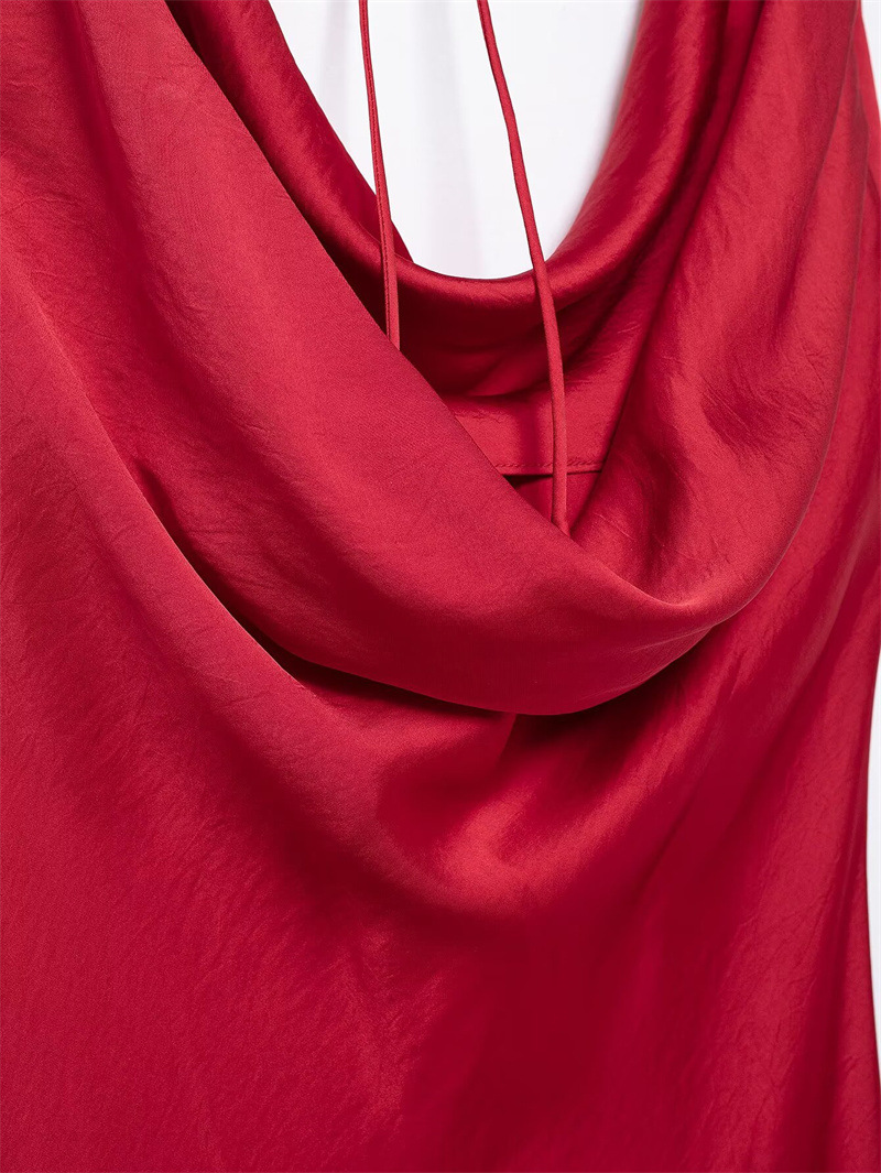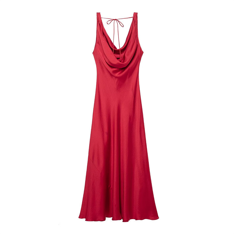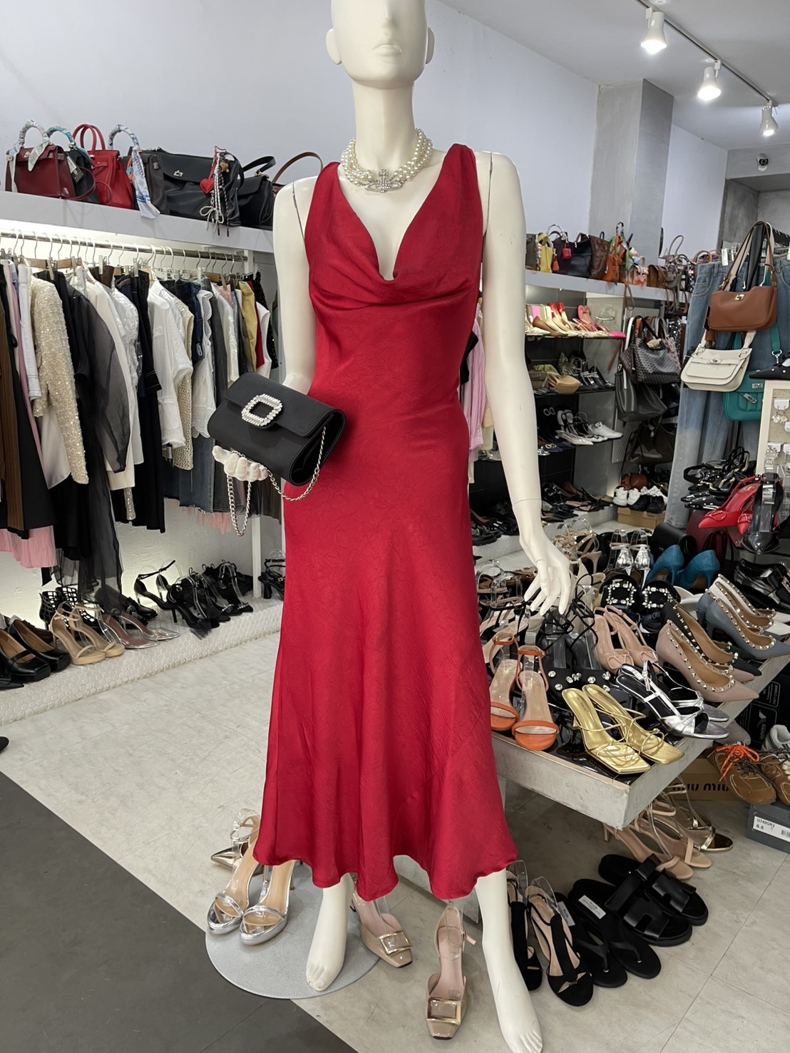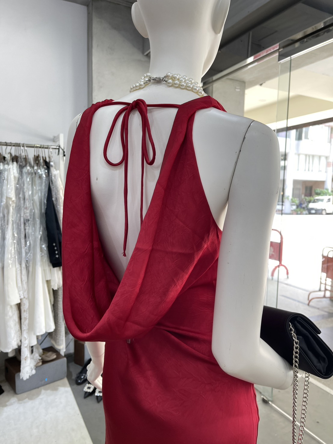 綢緞垂墜領 收腰長洋裝(紅/咖)