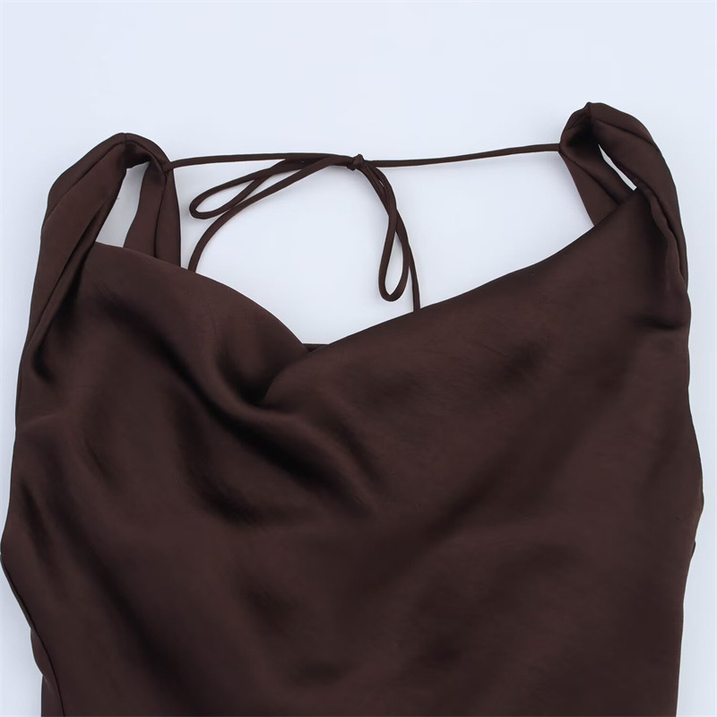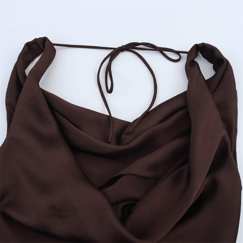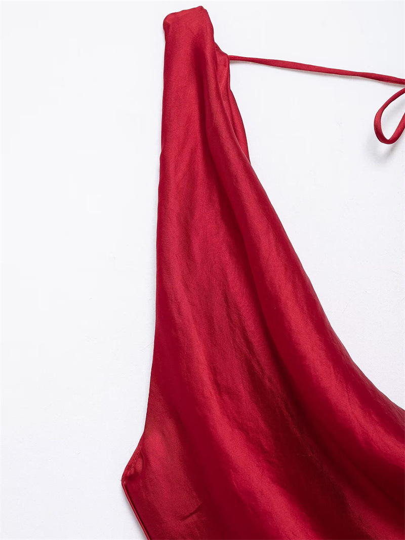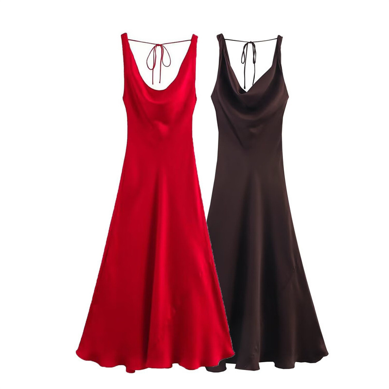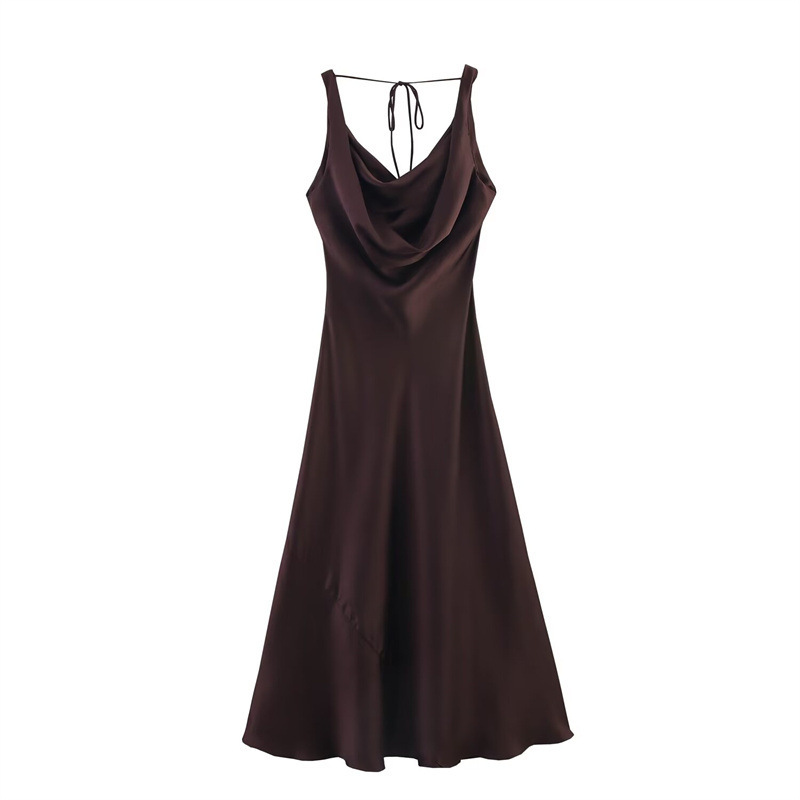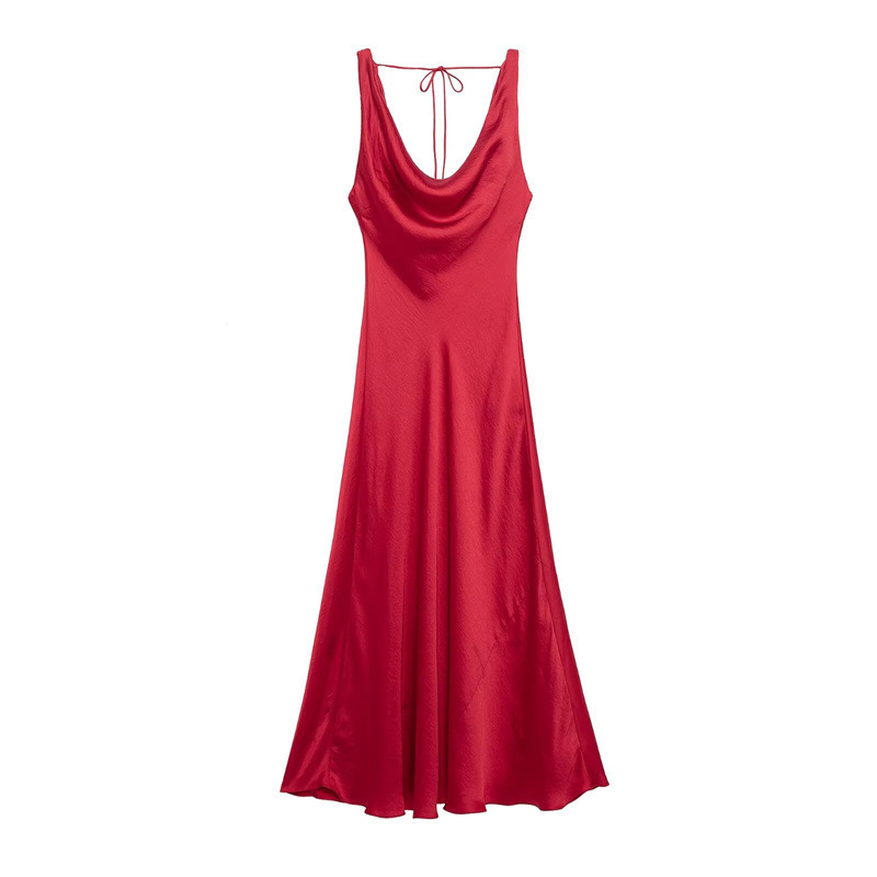 綢緞垂墜領 收腰長洋裝(紅/咖)