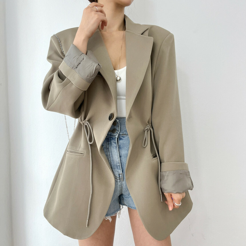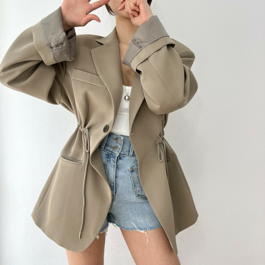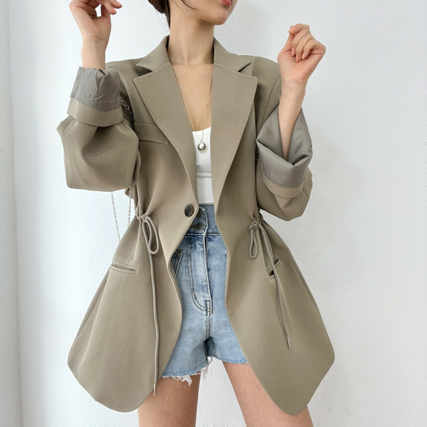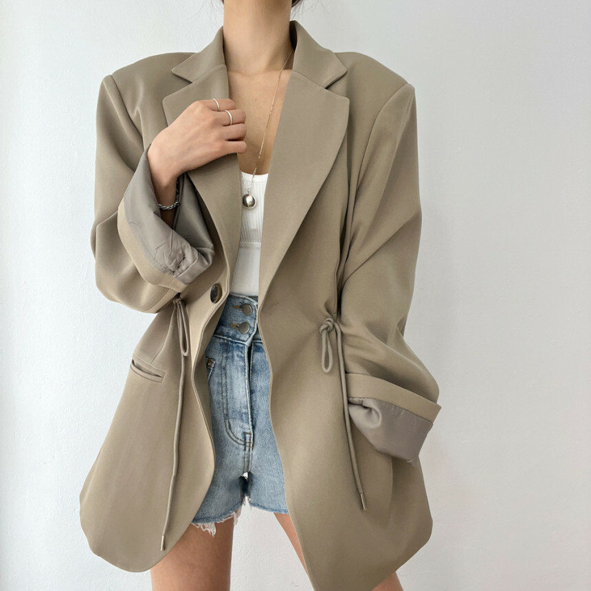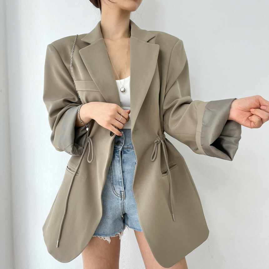 這件商品是採用簡約俐落的長版西裝剪裁,搭配收腰抽繩設計,能彰顯女性的迷人曲線。面料選用高質感的材質,有卡其色與黑色可選。利落的廓型與袖口設計,適合搭配各種造型,為造型增添優雅氣質。無論是上班族或是休閒約會,都能展現時尚氣質。