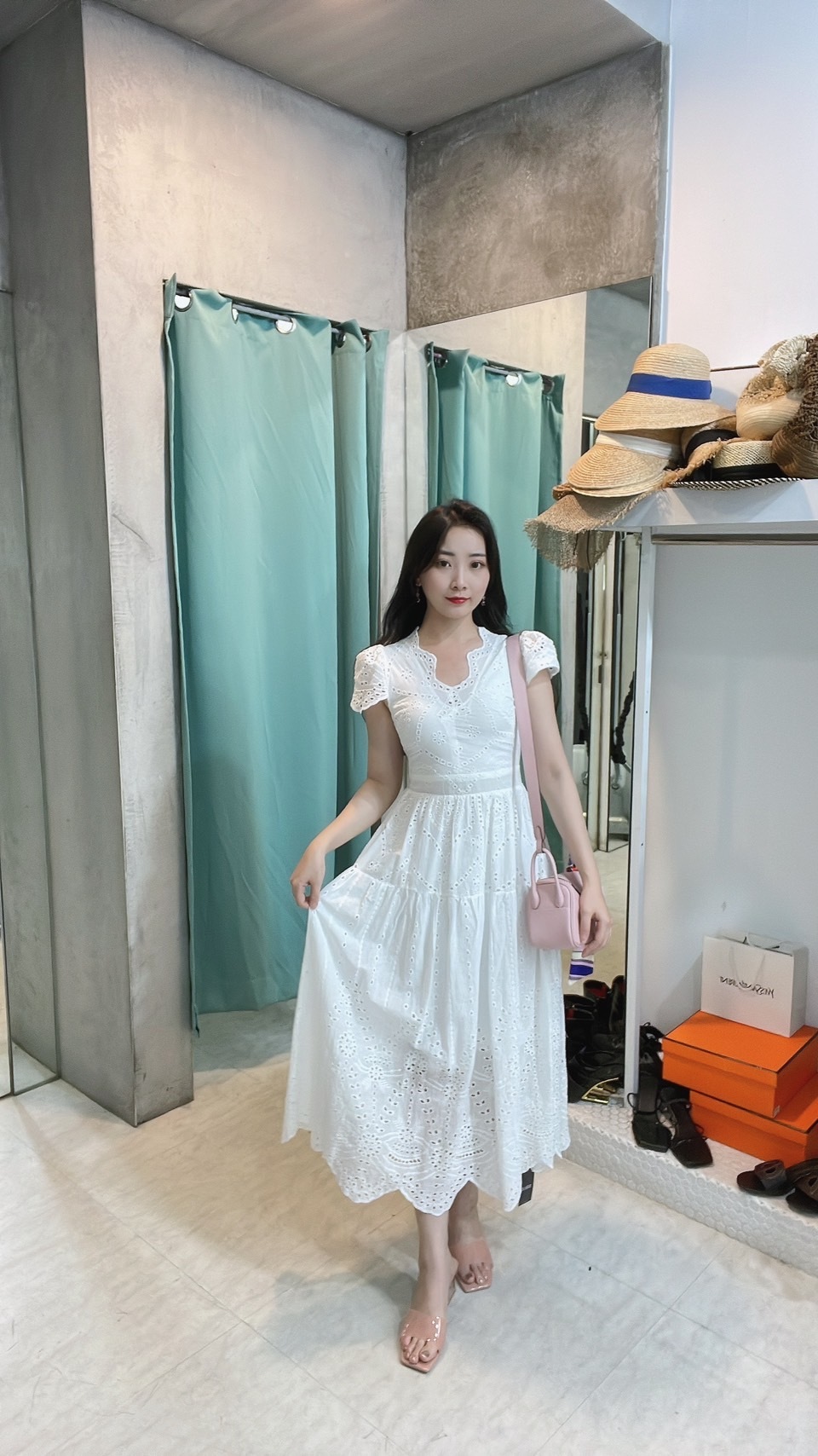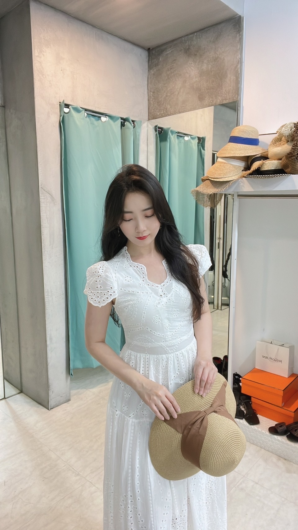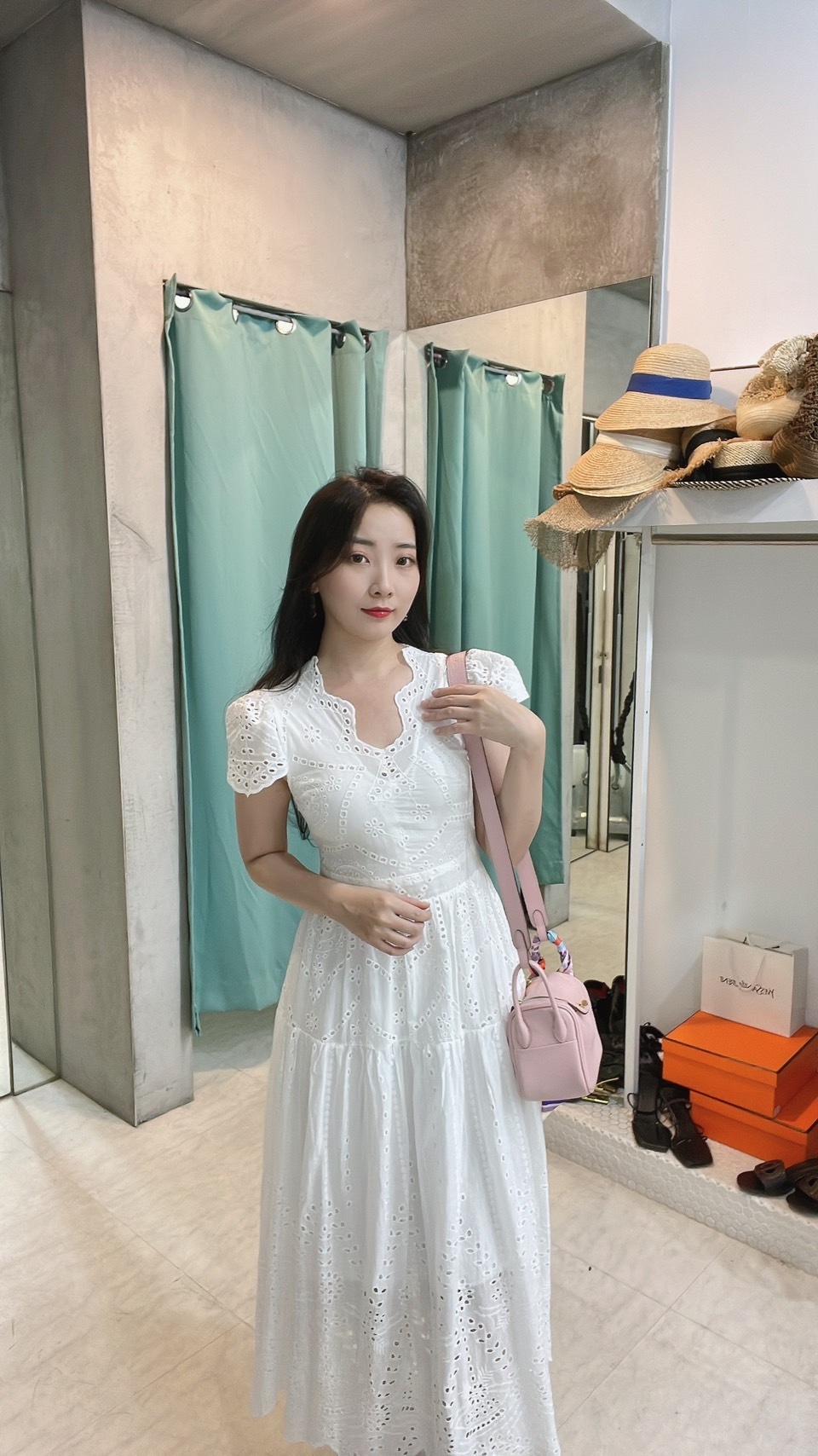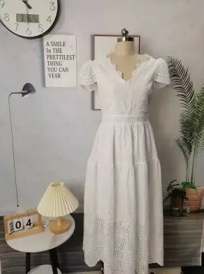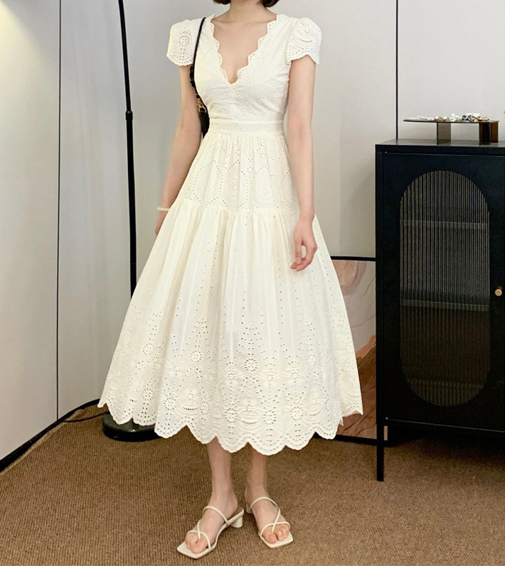 優雅氣質:純白色棉質洋裝,以刺繡帶出精緻優雅的氣質。