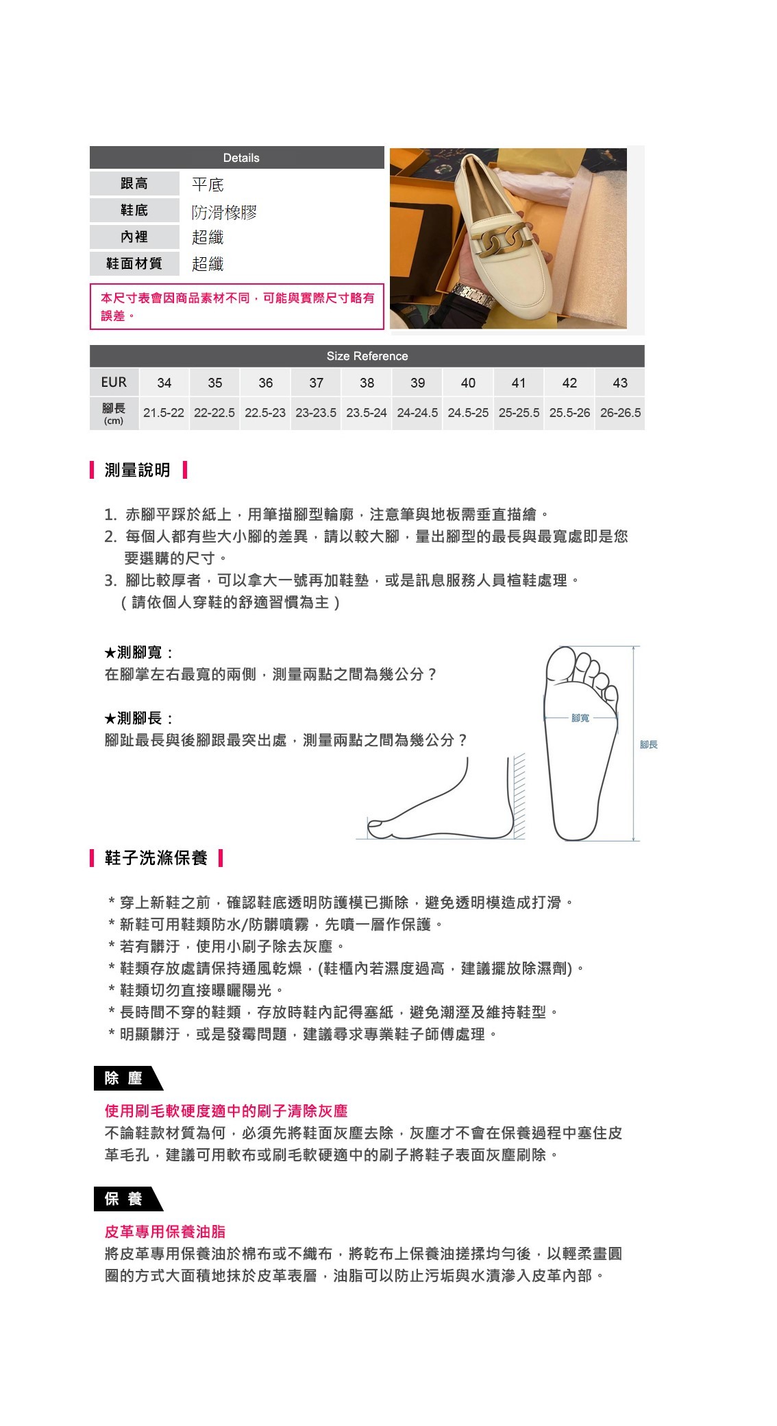 經典時尚的設計,搭配金色菱形鍊條裝飾,展現獨特的個人風格。 真皮材質穿著舒適,適合多種場合搭配。 簡約大方的輪廓剪裁,視覺線條流暢柔和。 提供黑色、白色、棕色等經典配色選擇,滿足不同喜好。 尺碼齊全,從34到40號都有,貼心照顧各種腳型需求。