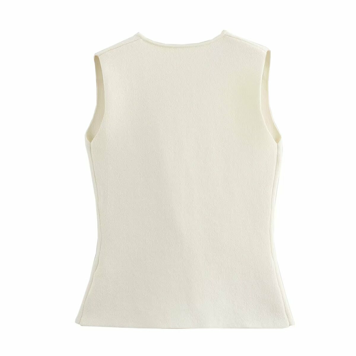 優雅自然的針織金釦背心,剪裁貼合身形,透氣舒適,與雪紡拼接長裙完美搭配,整體展現優雅隨興的氣質。