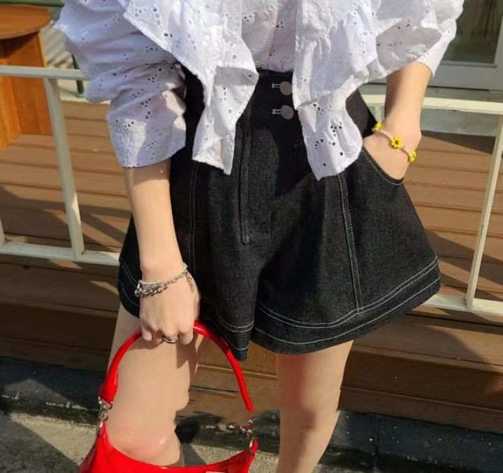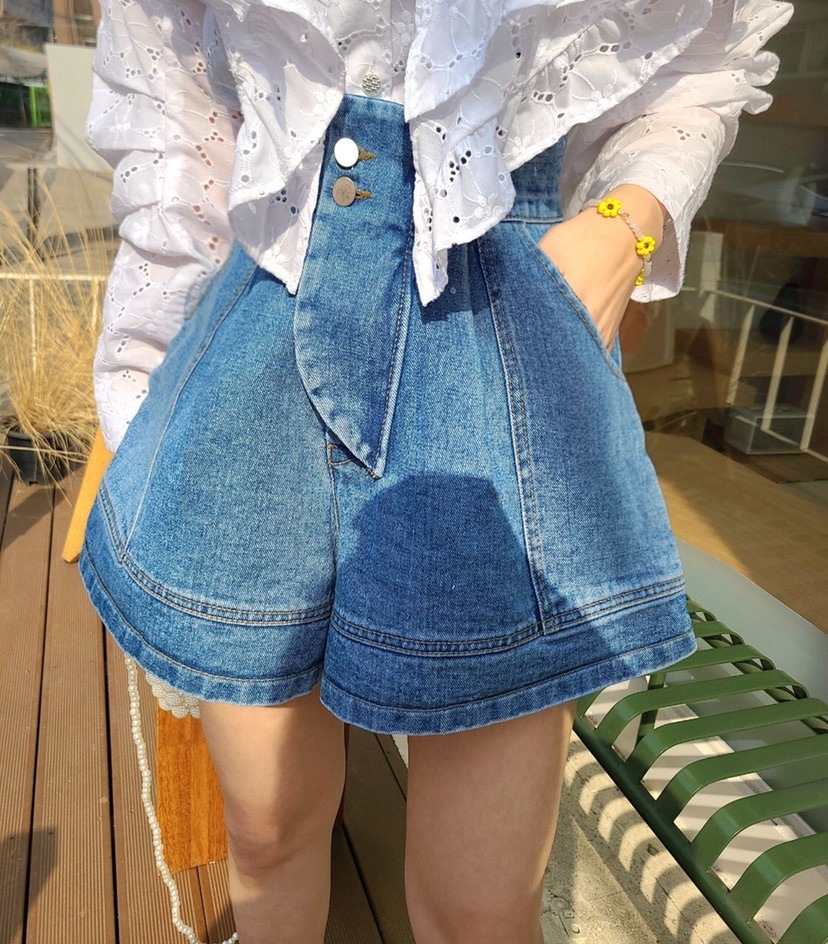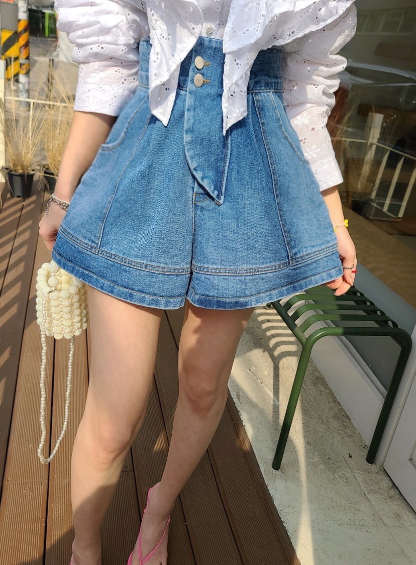 這件高腰牛仔褲裙,採用高級牛仔布料製作,採高腰剪裁,營造纖細腰身線條,兼具舒適與時尚。