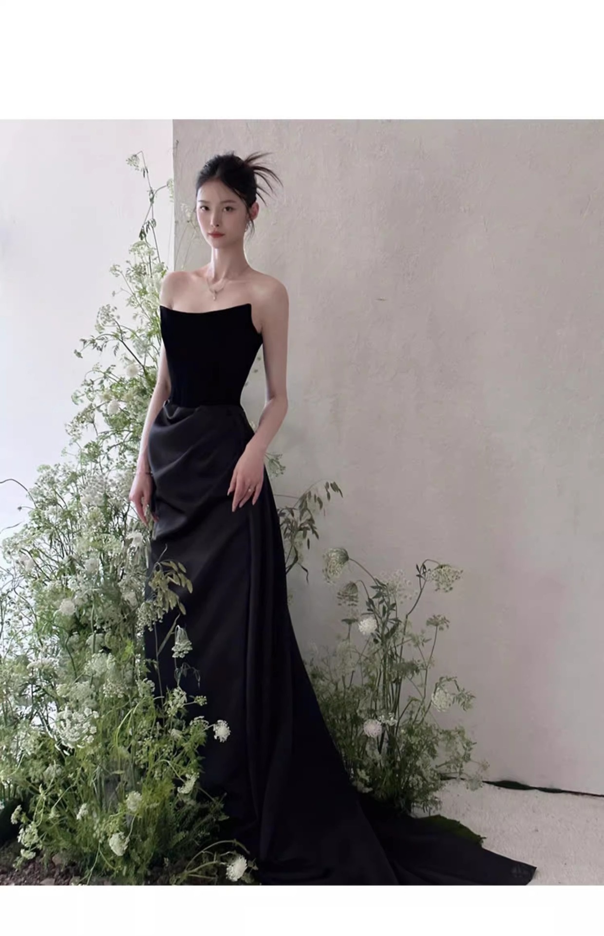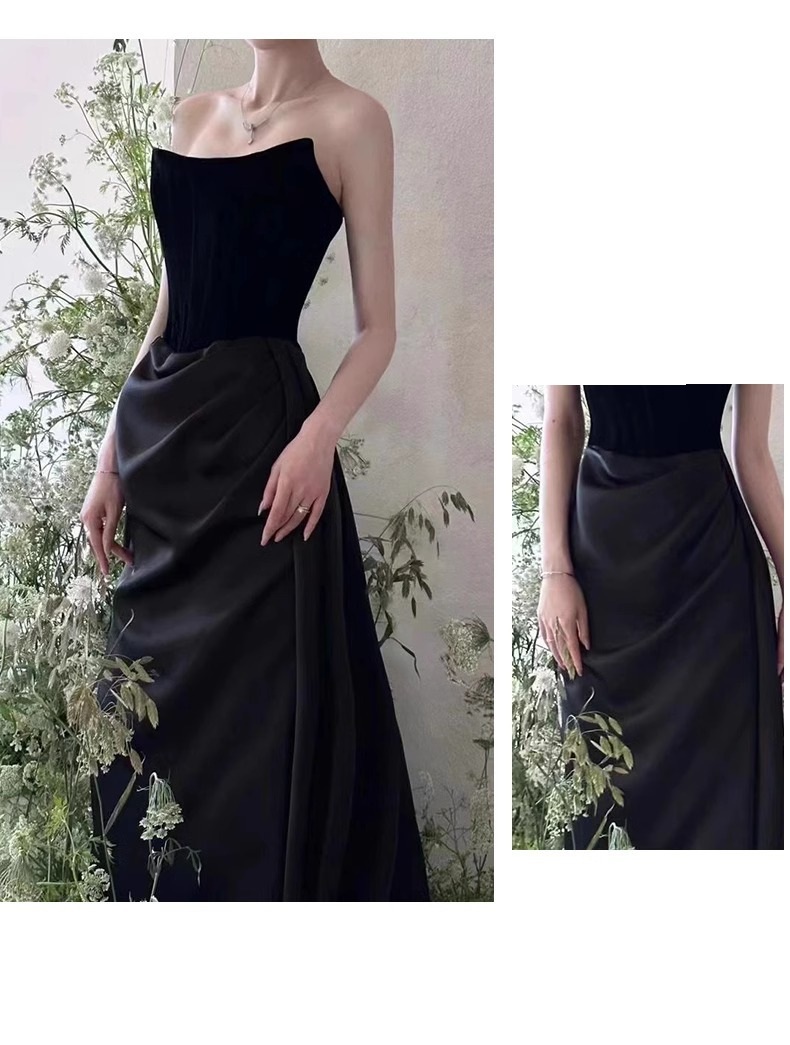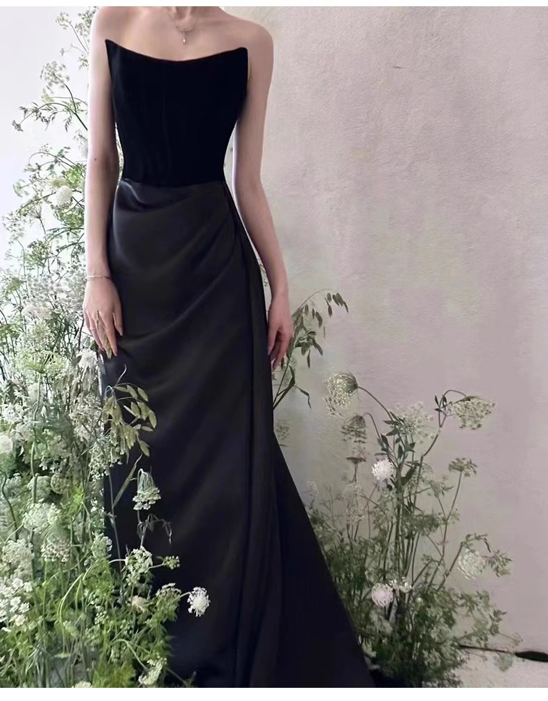 這件禮服採用天鵝絨與緞面拼接而成,營造出優雅動人的氣質;無袖設計展現肩頸線條,搭配低胸設計更添迷人魅力。黑色基調給人高雅睿智的韻味,搭配垂墜感的裙擺,舞動間流露出迷人的氣韻。無論是小型聚會或重要場合,這件禮服都能為您展現獨特的魅力。