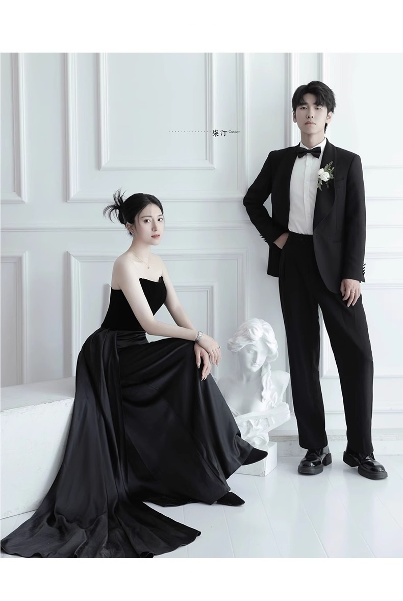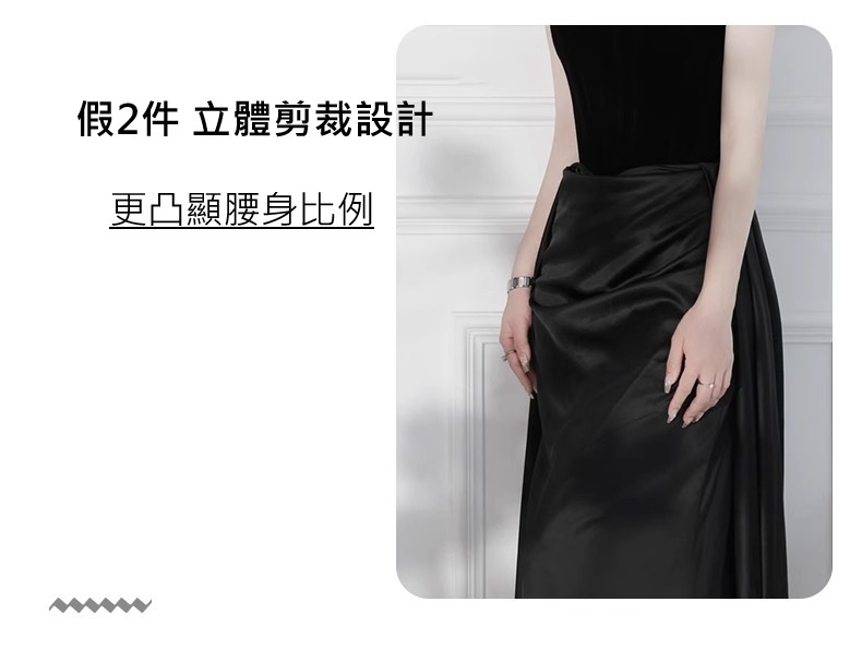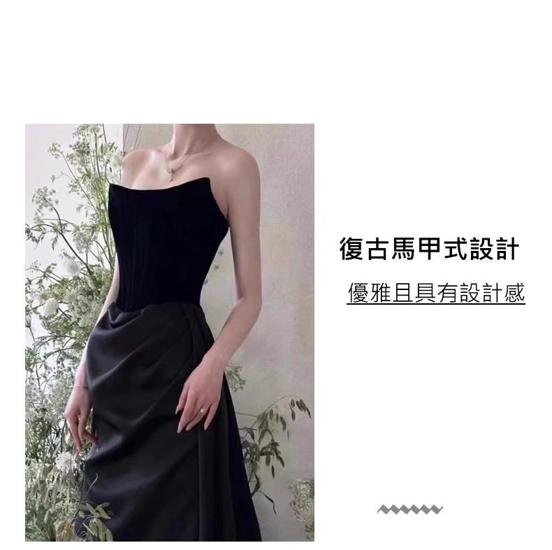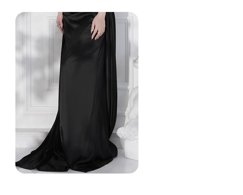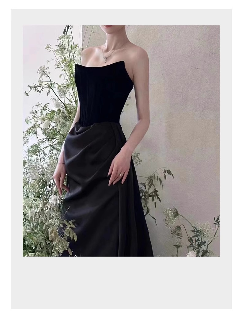 這件禮服採用天鵝絨與緞面拼接而成,營造出優雅動人的氣質;無袖設計展現肩頸線條,搭配低胸設計更添迷人魅力。黑色基調給人高雅睿智的韻味,搭配垂墜感的裙擺,舞動間流露出迷人的氣韻。無論是小型聚會或重要場合,這件禮服都能為您展現獨特的魅力。