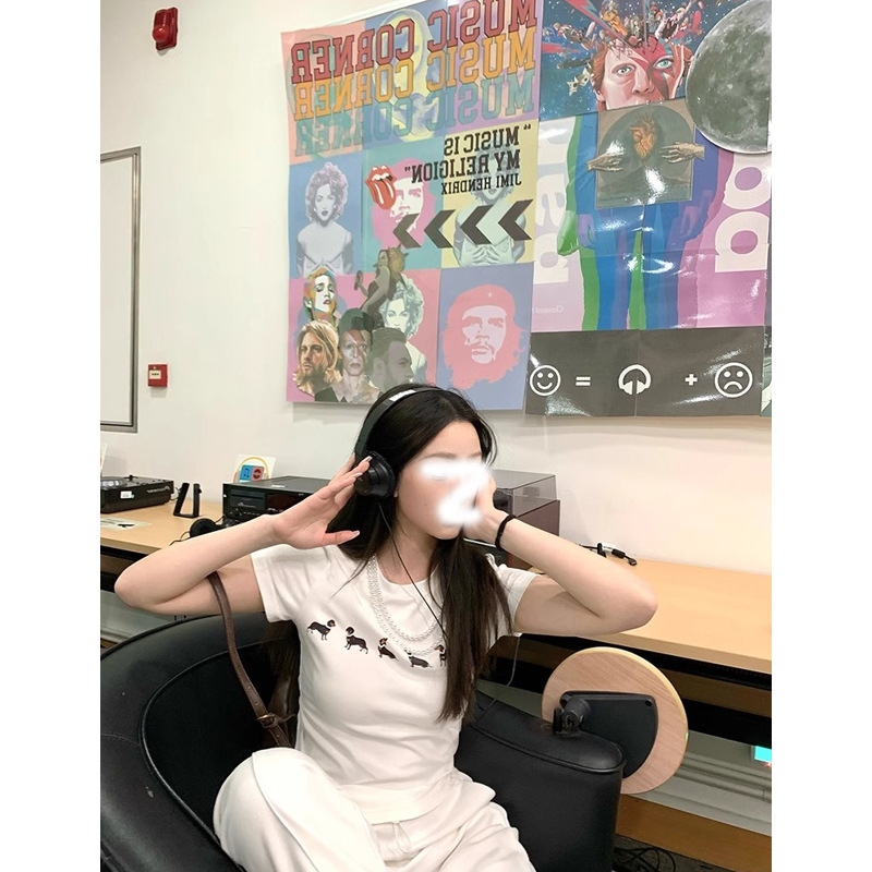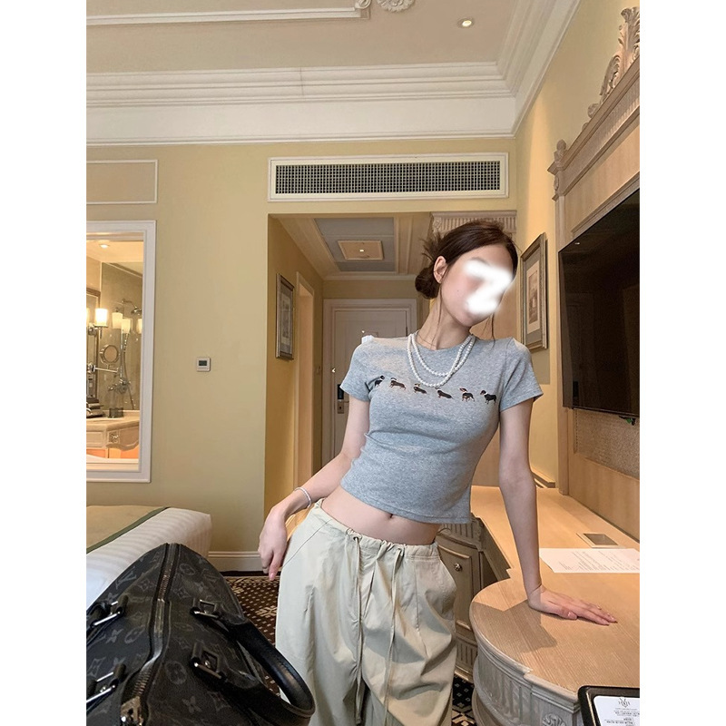 臘腸狗排排站 珍珠項鍊短袖上衣(灰/白)